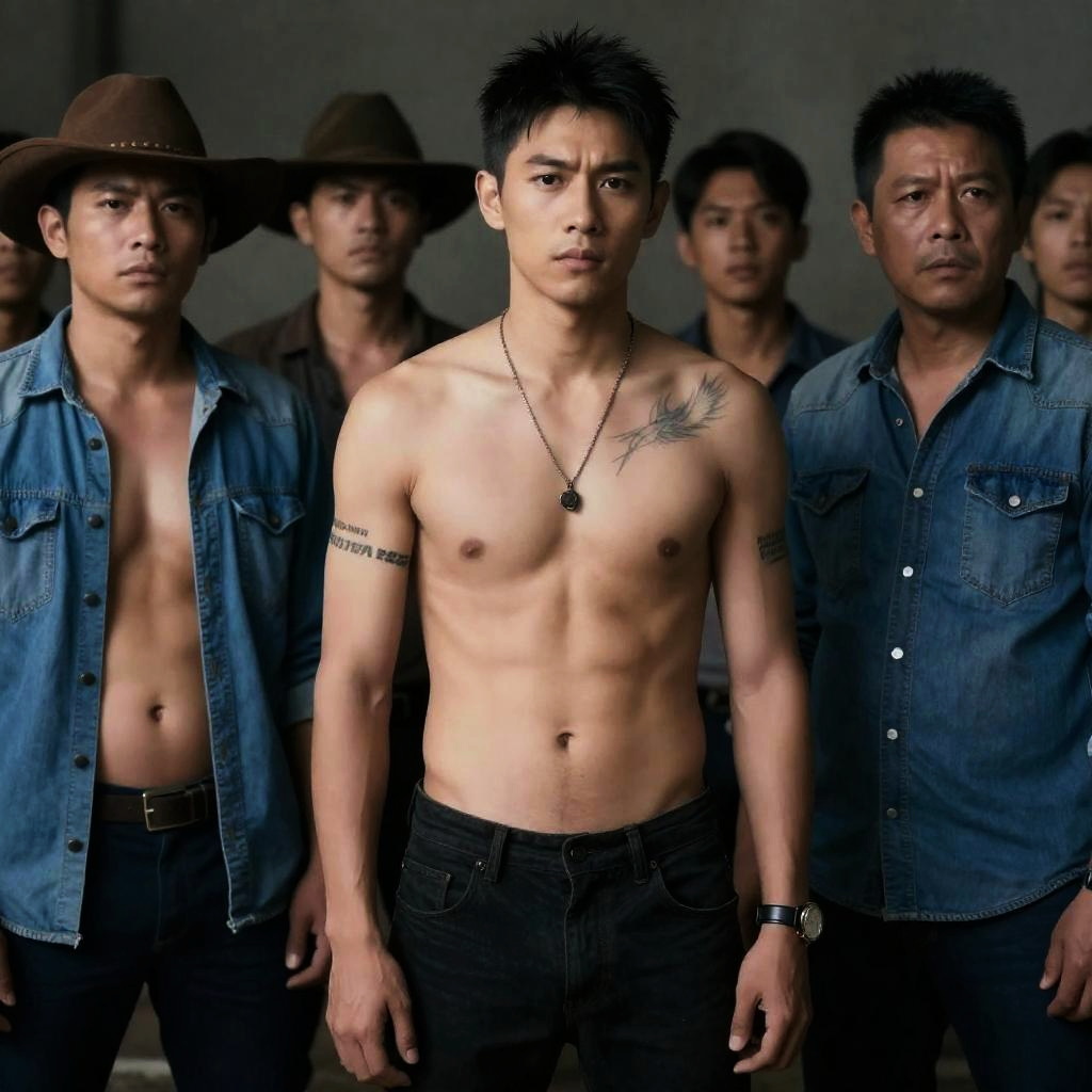 Shirtless man with wet hair, muscular build, and defined chest extends hand to older man with gray hair, dark shirt. Background: group of people, umbrella, soda cans, yellow pants. Intense expressions on shirtless man's face. Outdoor setting.