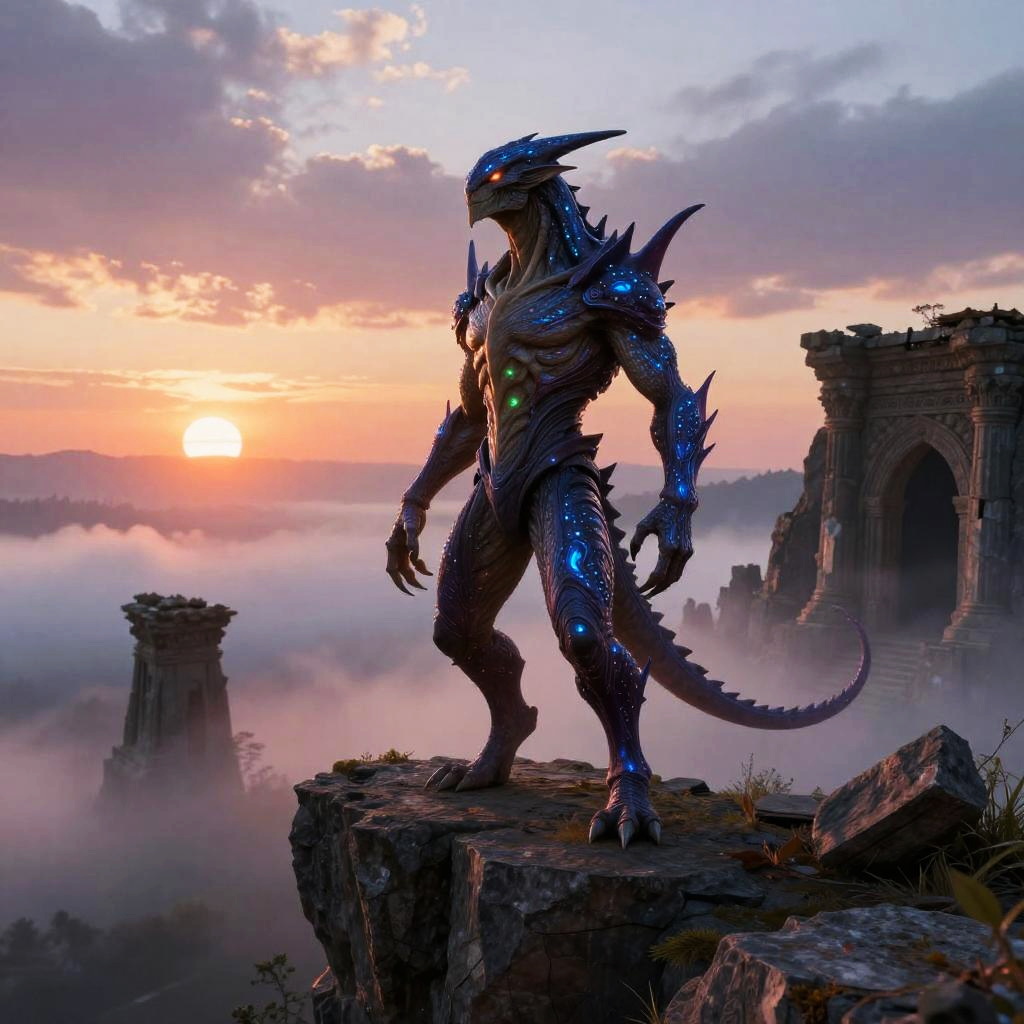 Smorm creature standing majestically on a rugged cliff at sunset, with glowing bioluminescent patterns on its skin, surrounded by mystical fog and ancient ruins, fantasy art style, highly detailed, vibrant colors, atmospheric lighting