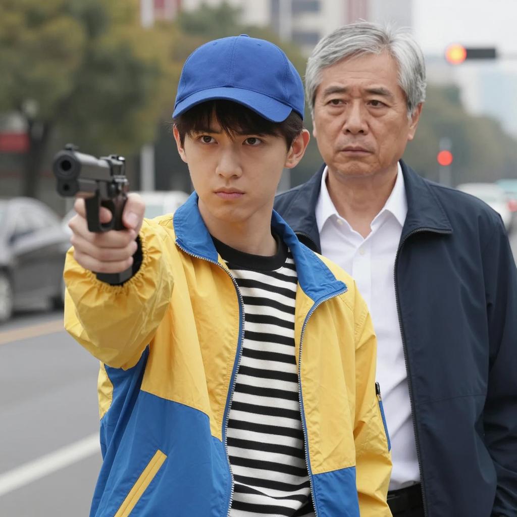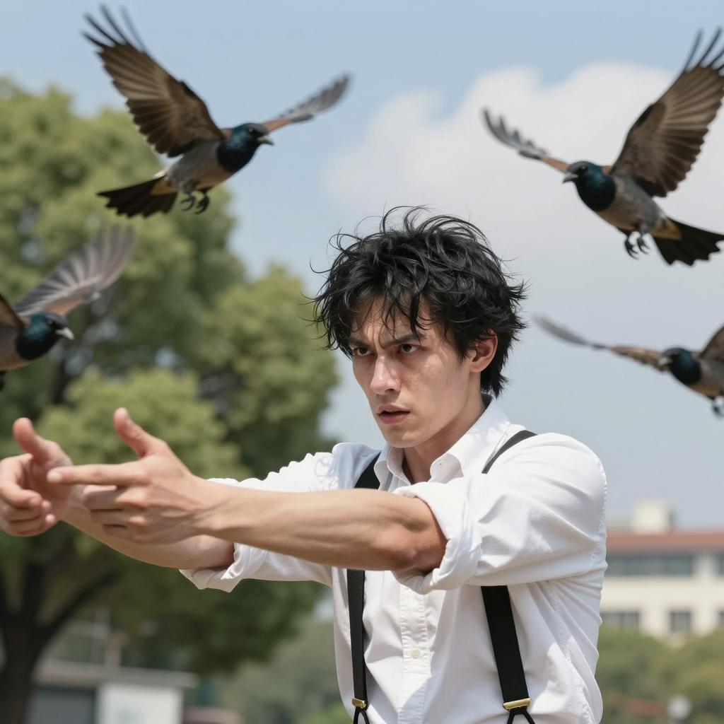 Man with disheveled black hair, white shirt, black suspenders, intense expression, wielding metal hand with knives. Background: green tree, blue sky with clouds. Objects: blurred motion, knives in hand, car partially visible on right.