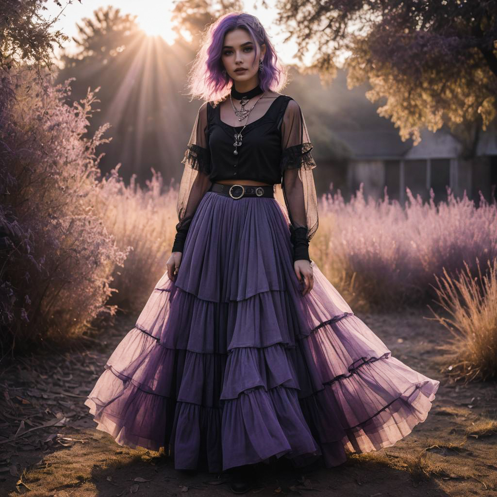 Pastel goth outfit, worn by Dark fantasy artist, featuring vintage shirt layered with mesh and long flowy skirt, in evil silver and purple, captured in ethereal dreamy look with golden hour sunlight.