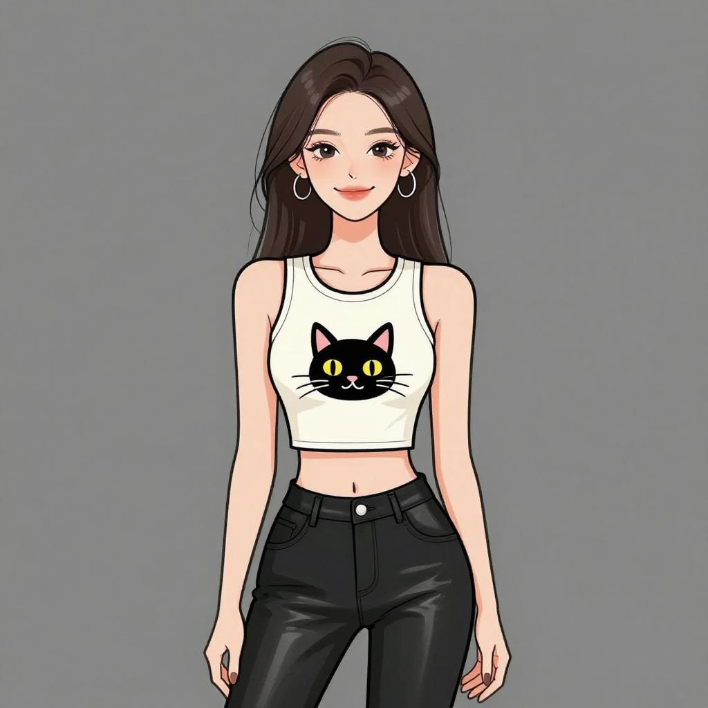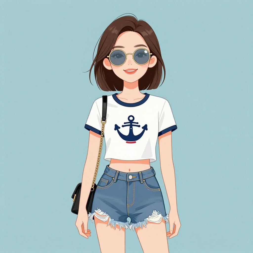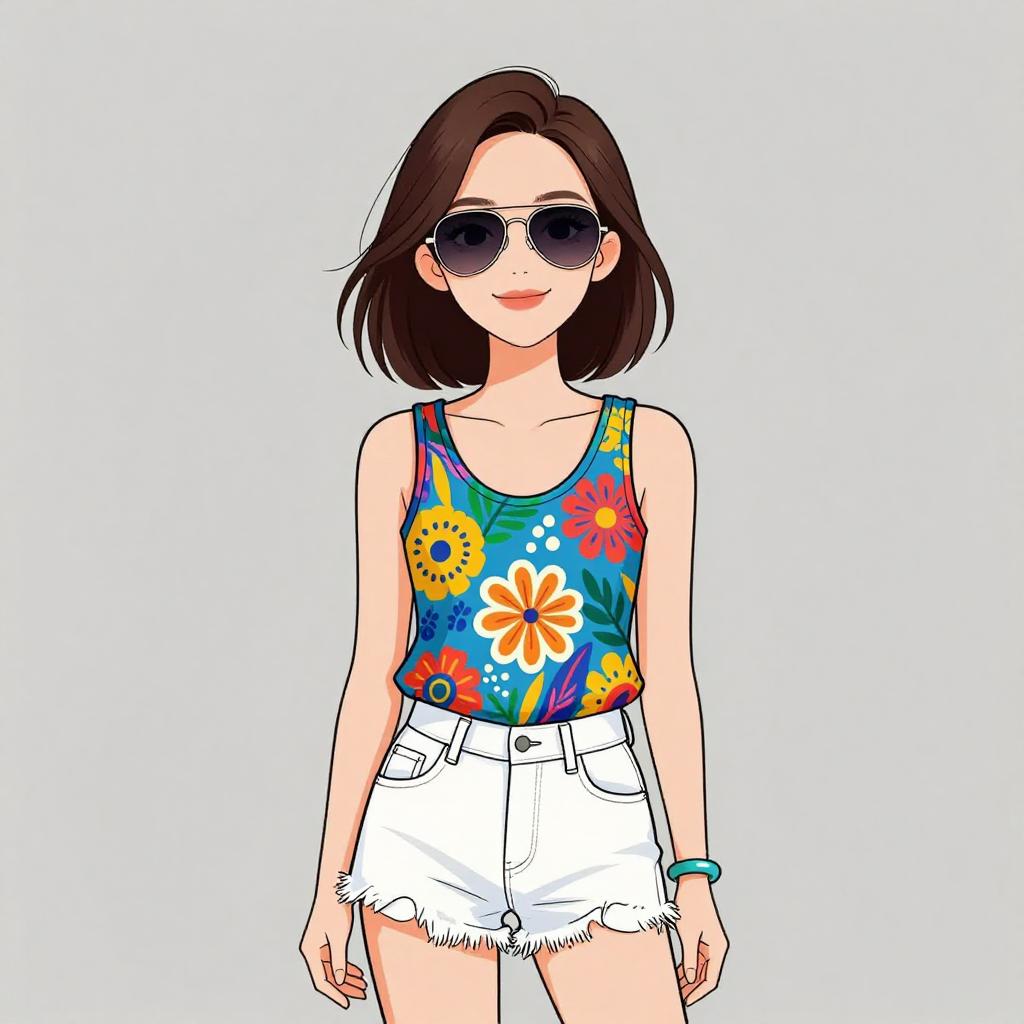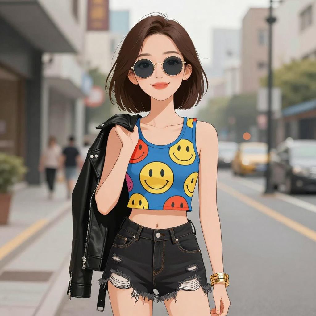 Woman with pretty face and pretty hair. smiling Woman, modern urban, emoji print sleeveless crop top in vivid colors, round neckline, black distressed denim shorts, edgy black leather jacket draped over one shoulder, round mirrored sunglasses, chunky gold bangle bracelet. --sref 1467