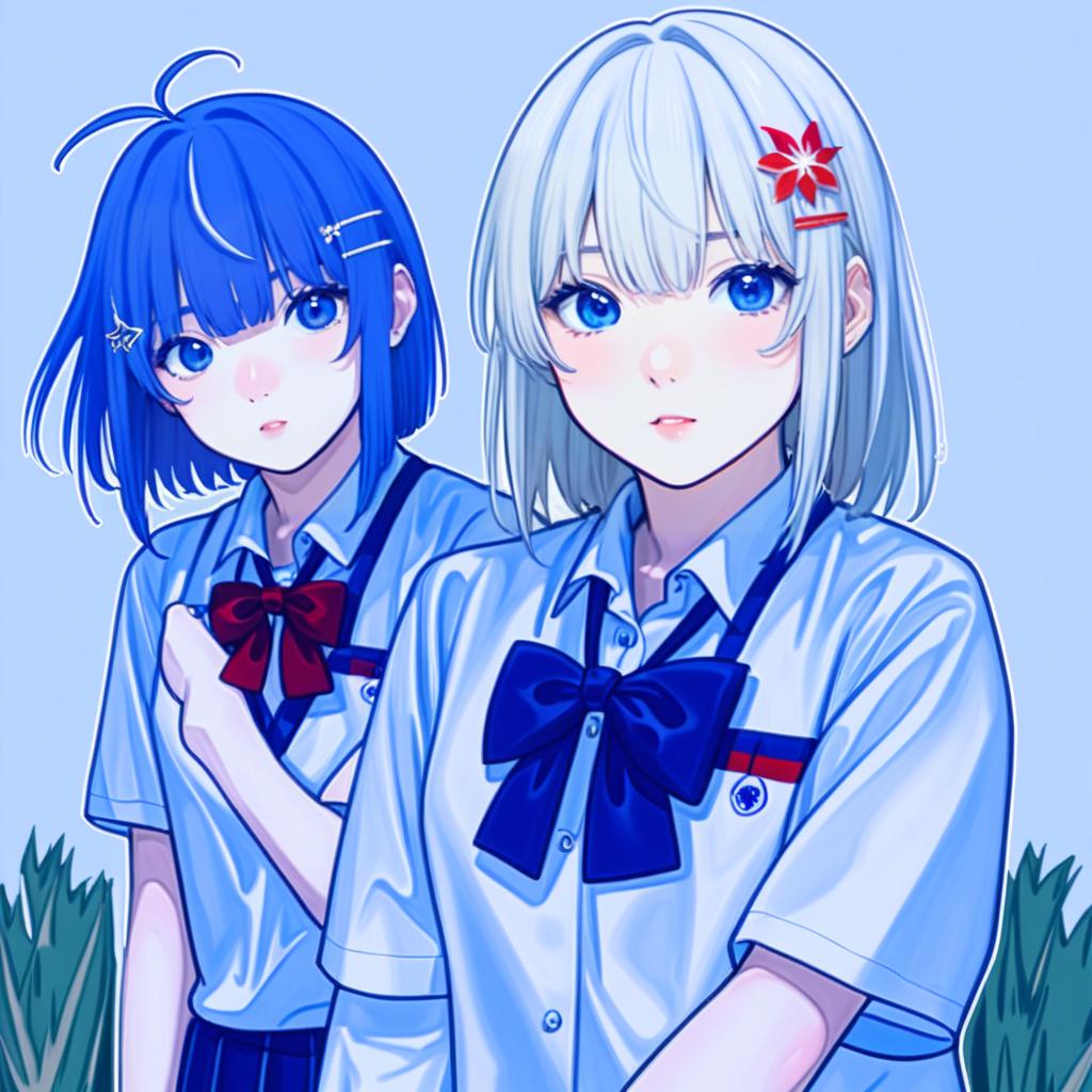 Aizawa kazuha, assault lily, 1girl, blue eyes, blue hair, asymmetrical hair, short hair, medium hair, blunt bangs, hairclip, medium breasts, herensuge girls academy school uniform, school uniform, long sleeves, red bowtie, by artist gomzi, anime