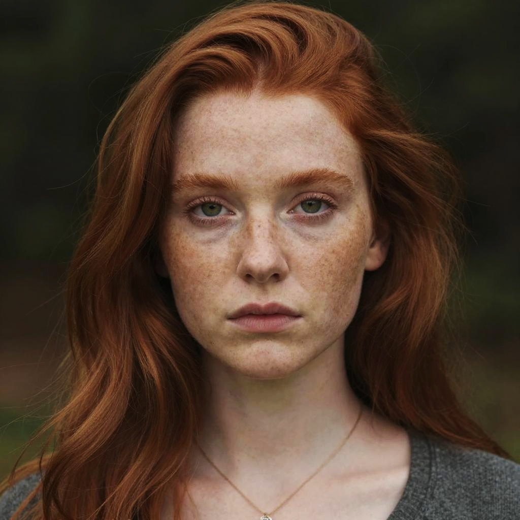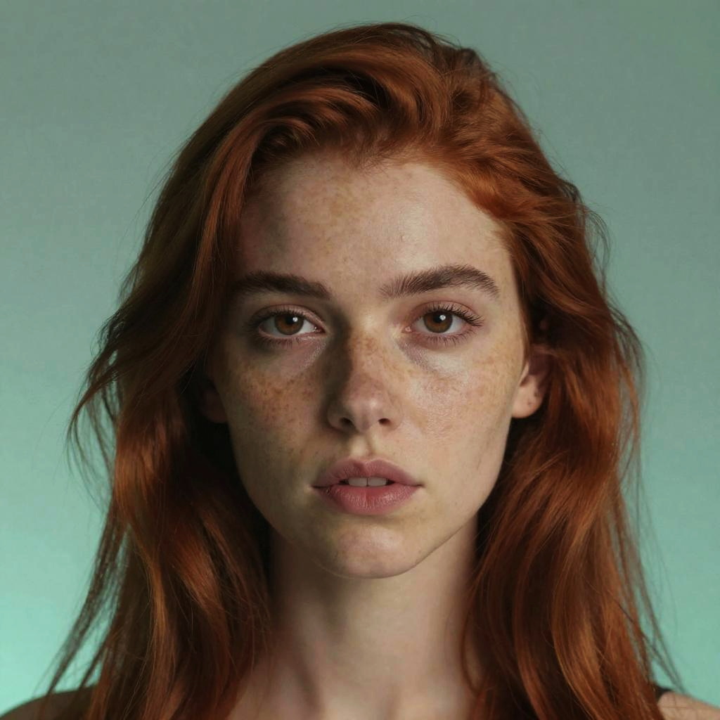 (masterpiece, best quality, ultra realistic, 32k, RAW photo, high detailed skin, 8k uhd, dslr, high quality, film grain:1.1), long hair, Copper hair:1.1, portrait, lady, brown eyes, Amaranth cyberpunk, freckles, (Teal gradient background, led light, edge light, simple background)