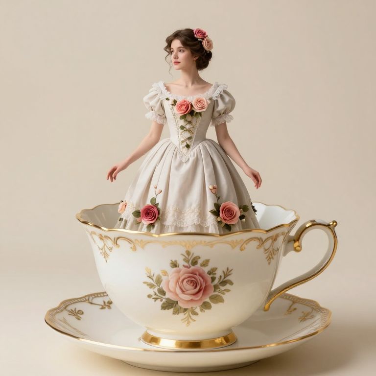 A delicate lady in a crinoline dress adorned with blooming roses stands gracefully inside an oversized, ornate teacup, defying scale and reality in a whimsical, fantastical scene.