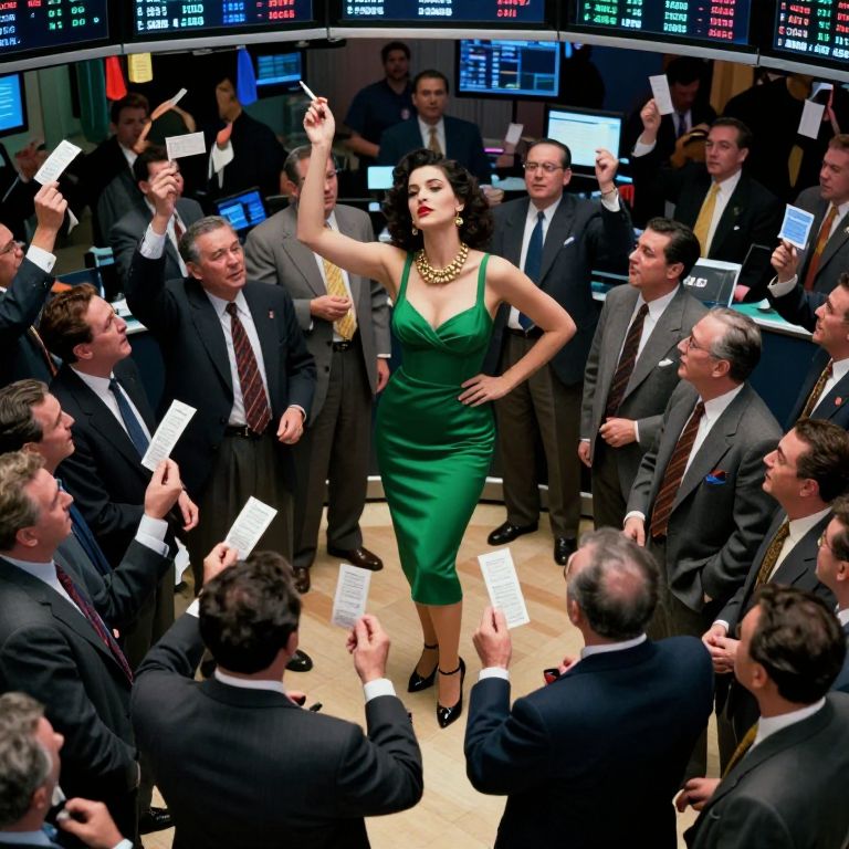 The image depicts a vibrant scene on a stock market floor, viewed from an elevated perspective. At the center, a burlesque dancer stands out, towering over the surrounding crowd of stock traders. She is adorned in a striking green dress, complemented by a gold necklace and earrings, exuding an air of confidence and allure. The dancer's pose is dynamic, with one arm raised and a cigarette held in her hand, adding to the sense of movement and energy. The crowd of traders, dressed in suits and ties, is densely packed, with many holding tickets above their heads, indicating an active trading session. The overall composition is rich with detail, from the intricate textures of the traders' clothing to the lively interaction between the dancer and the crowd. The scene is a blend of historical and modern elements, capturing a moment of high energy and excitement on the stock market floor.