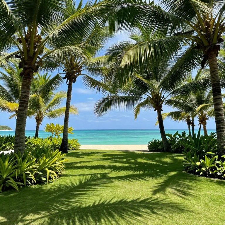 An oasis of serenity and escape, this tropical garden invites contemplation amidst the gentle rustle of palm fronds, the cool embrace of turquoise waters, and the earthy aroma of lush greenery, embodying a harmonious blend of freedom and tranquility.