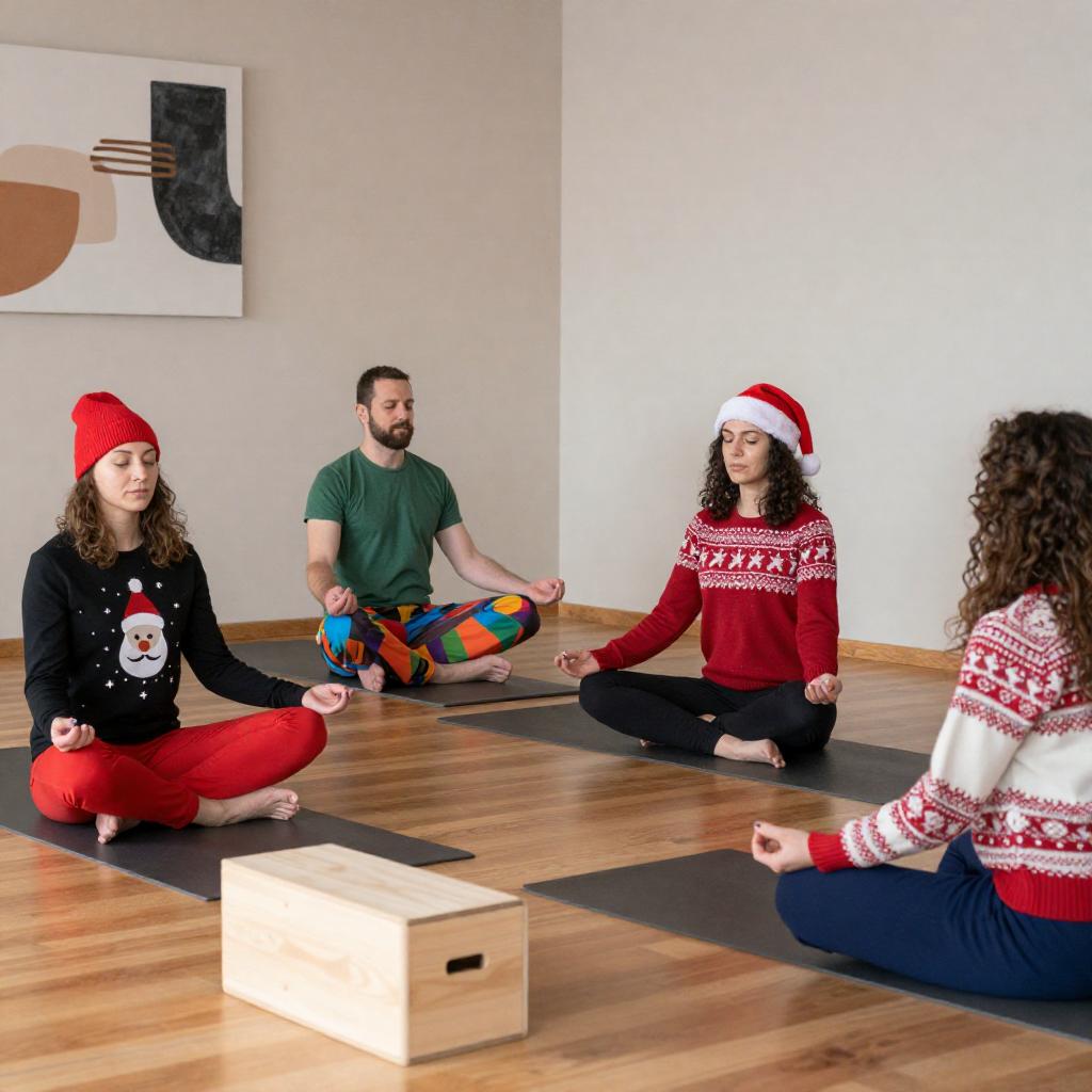 Four people meditating on yoga mats in a room. Woman in black and red holiday-themed outfit, red hat, sitting cross-legged. Man in green shirt, colorful pants, sitting cross-legged. Woman in red sweater with white patterns, Santa hat, sitting cross-legged. Woman with curly hair, red and white sweater, blue pants, sitting cross-legged. Light wood floor, abstract wall art, beige walls. Light wooden box on floor. Casual, relaxed atmosphere.