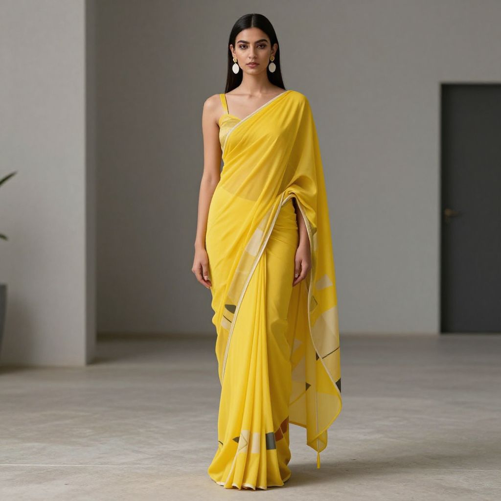 A modern fashion shot of a contemporary model wearing a high-end yellow saree with geometric designs, standing in a minimalist urban setting, soft studio lighting, clean lines, vibrant contrast, fashion editorial, realistic rendering, MidJourney style.