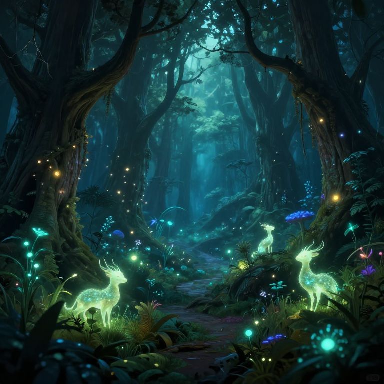 This digital fantasy artwork depicts a mystical forest at night. Tall, dark trees with twisted branches frame a luminous path. Bioluminescent deer with glowing, neon-green bodies and antlers stand amidst vibrant, glowing mushrooms and fireflies. The forest floor is covered in lush, dark green foliage, with blue and purple hues adding depth. Light filters through the trees from above, casting a magical, ethereal glow. The scene is rich in color contrasts, with dark blues and greens against the bright, glowing elements, creating a magical, enchanted atmosphere. The style is highly detailed and vibrant, reminiscent of fantasy illustrations.