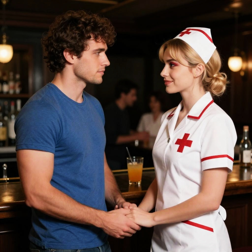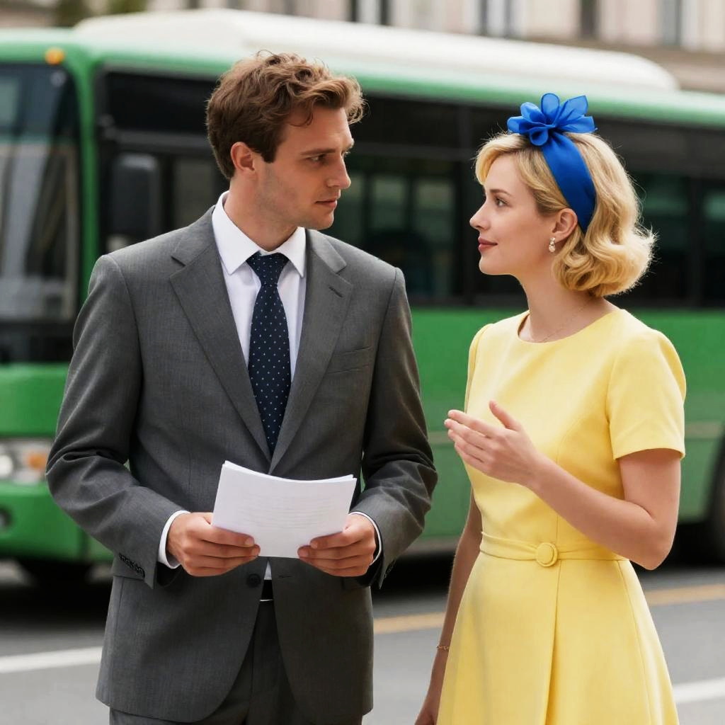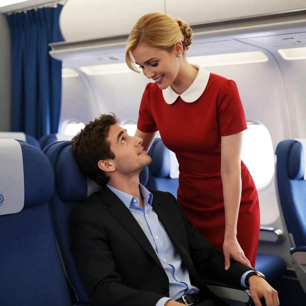 Photograph of a blonde woman in a red dress with a white collar, leaning over a seated man in a black suit and blue shirt on a blue-upholstered airplane. Woman smiling, man looking up. Blue curtains and seats in background. Woman's right hand on seatback, man's left hand on seat.