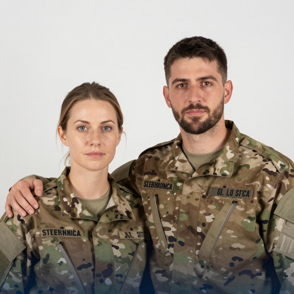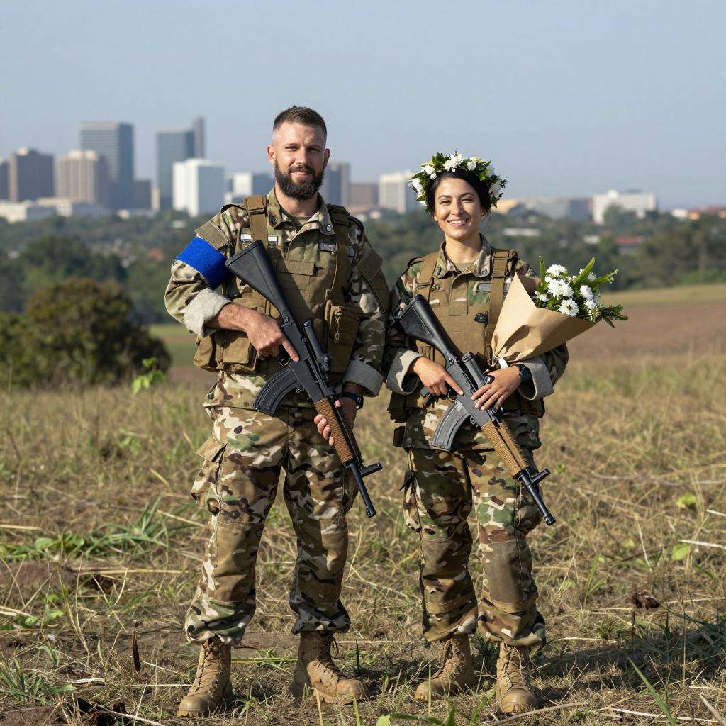 Photograph of two soldiers standing on a roadside. Woman with dark hair, olive skin, and brown eyes, holding a rifle across her chest. Man with gray hair, beard, and tan skin, standing behind her, holding a rifle. Both wear camouflage uniforms and tan boots. Green bushes and a small wooden structure in the background. Date stamp in bottom left corner. Woman smiles slightly, man has neutral expression. Both rifles are black with large barrels. Man's left arm around woman's shoulders.