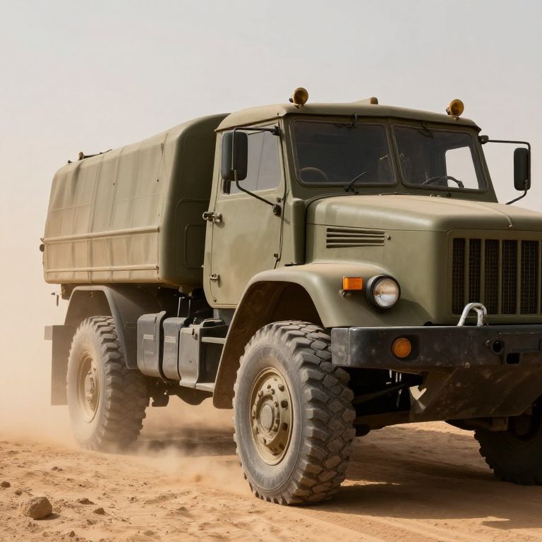 Photograph of a rugged, olive-green military truck with large tires, dust flying as it drives on a sandy desert road.