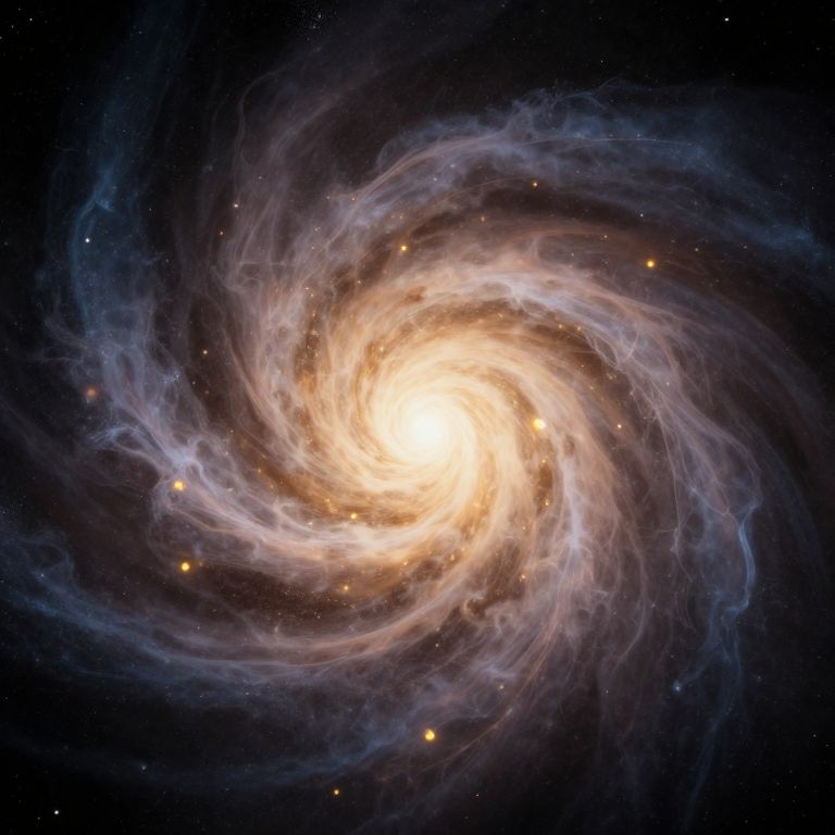 Photograph of a spiral galaxy with a bright, glowing center, surrounded by swirling, wispy arms of gas and stars in a dark, star-spe
