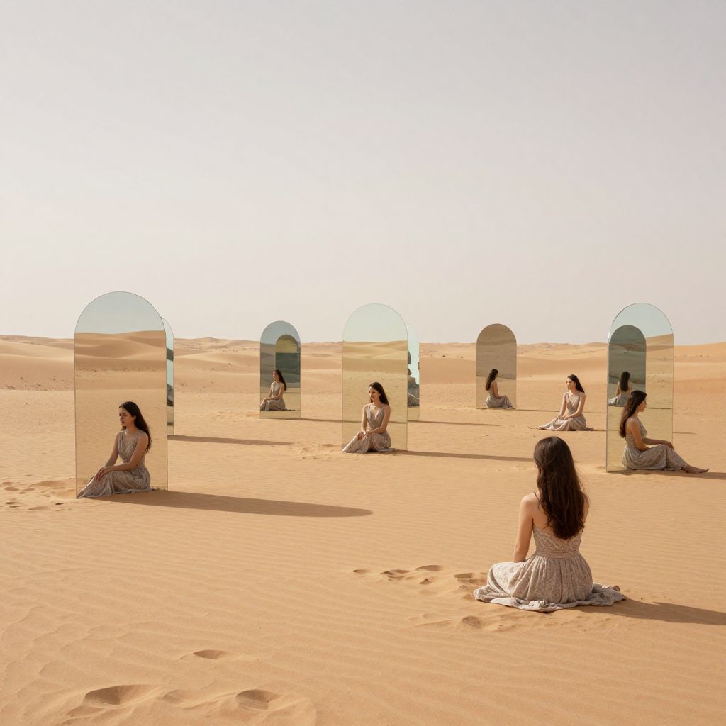 In a surreal desert expanse, a woman sits amidst an endless array of arching mirrors, each reflecting infinite iterations of herself—a poignant dance between solitude and multiplicity, where the echoes of choice and consequence resonate like whispers in the still air.