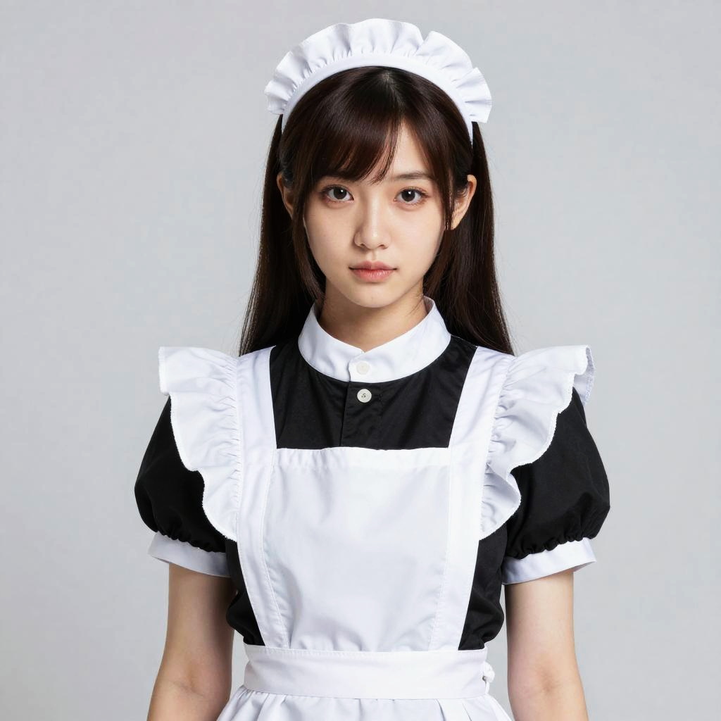 Photograph of an Asian woman with fair skin and long black hair, wearing a classic French maid outfit. She has a white headband with a bow, a black dress with white puffed sleeves, and a white apron with ruffles. Her expression is gentle with a slight smile, and she has red lipstick. The background is plain white, making her outfit the focal point. The image is brightly lit, highlighting the contrast between the black and white elements of her attire.