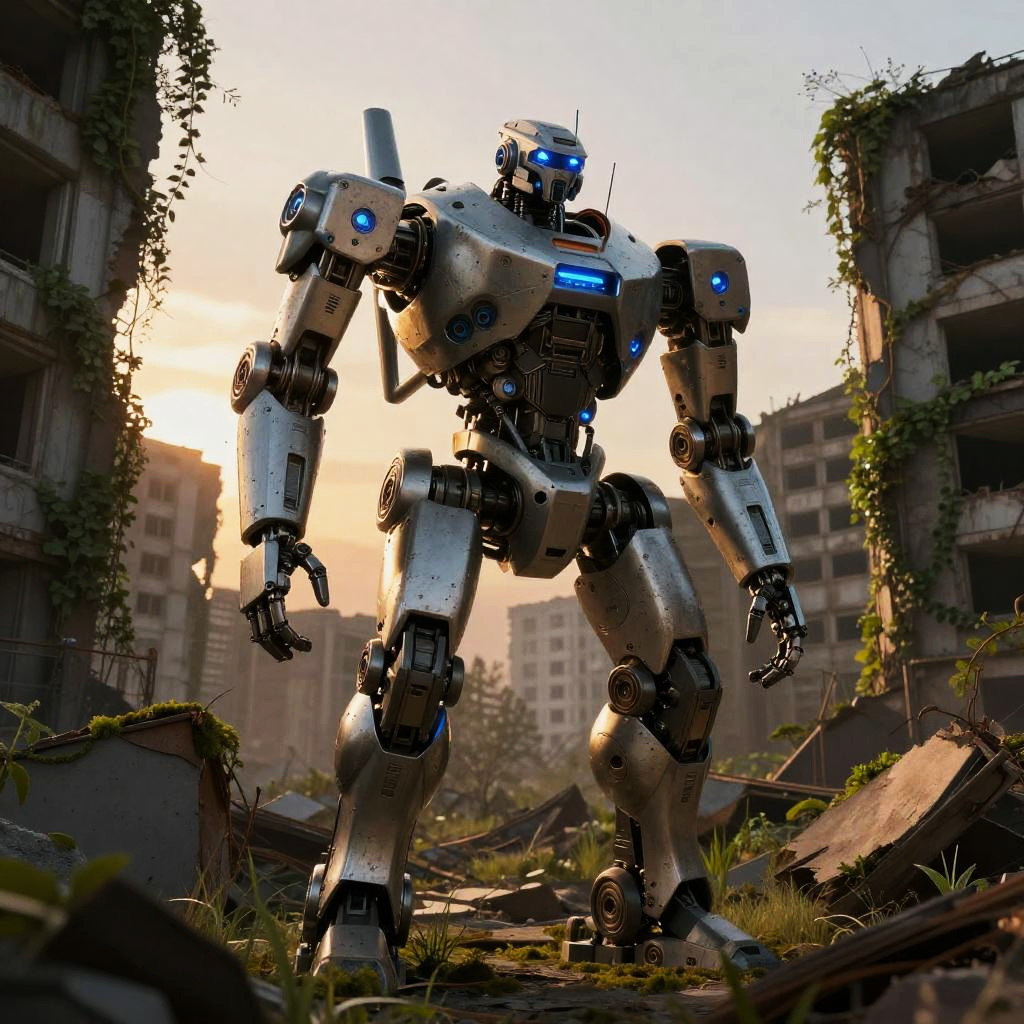 S7 advanced robot in a post-apocalyptic world, standing amidst ruined buildings overgrown with vines and moss, dramatic sunset lighting, high detail mechanical parts with glowing blue accents, gritty and moody scene.
