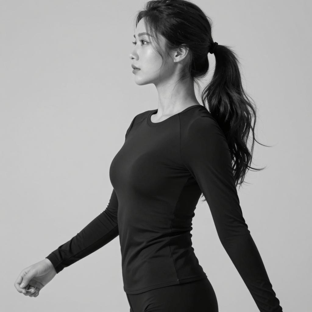 Black and white photograph of a woman in profile, long wavy hair in a ponytail, wearing a tight-fitting black long-sleeve top, neutral expression, soft shadows, simple background, upper body visible, arms slightly raised.