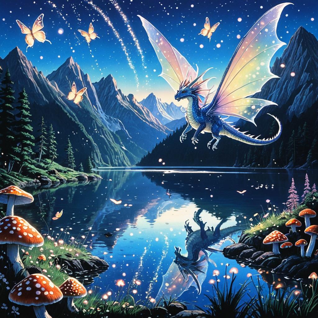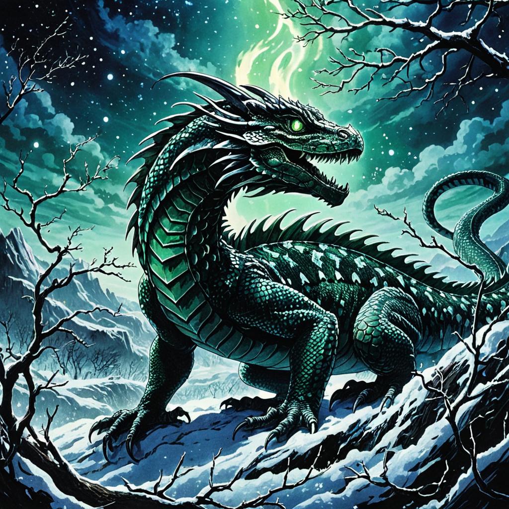 A sky leviathan, with translucent vaporous wings, aurora-like radiant trails, soaring over a vast ocean under a crescent moon, surrounded by glittering meteors and luminous frost shards, drawn in the majestic and symbolic anime style of Osamu Tezuka.