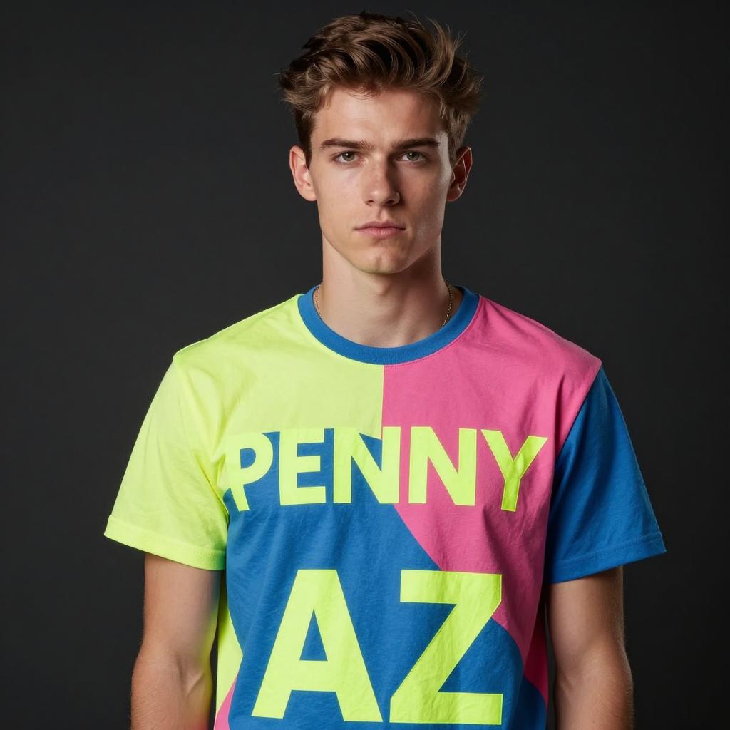 Portrait of a young white male with short brown hair wearing a vibrant, colorful graphic t-shirt featuring the text 'PENNY AZ' in neon colors. The subject has a serious expression, is photographed in a studio setting with black background and professional lighting, capturing an upper body shot with a modern fashion style.