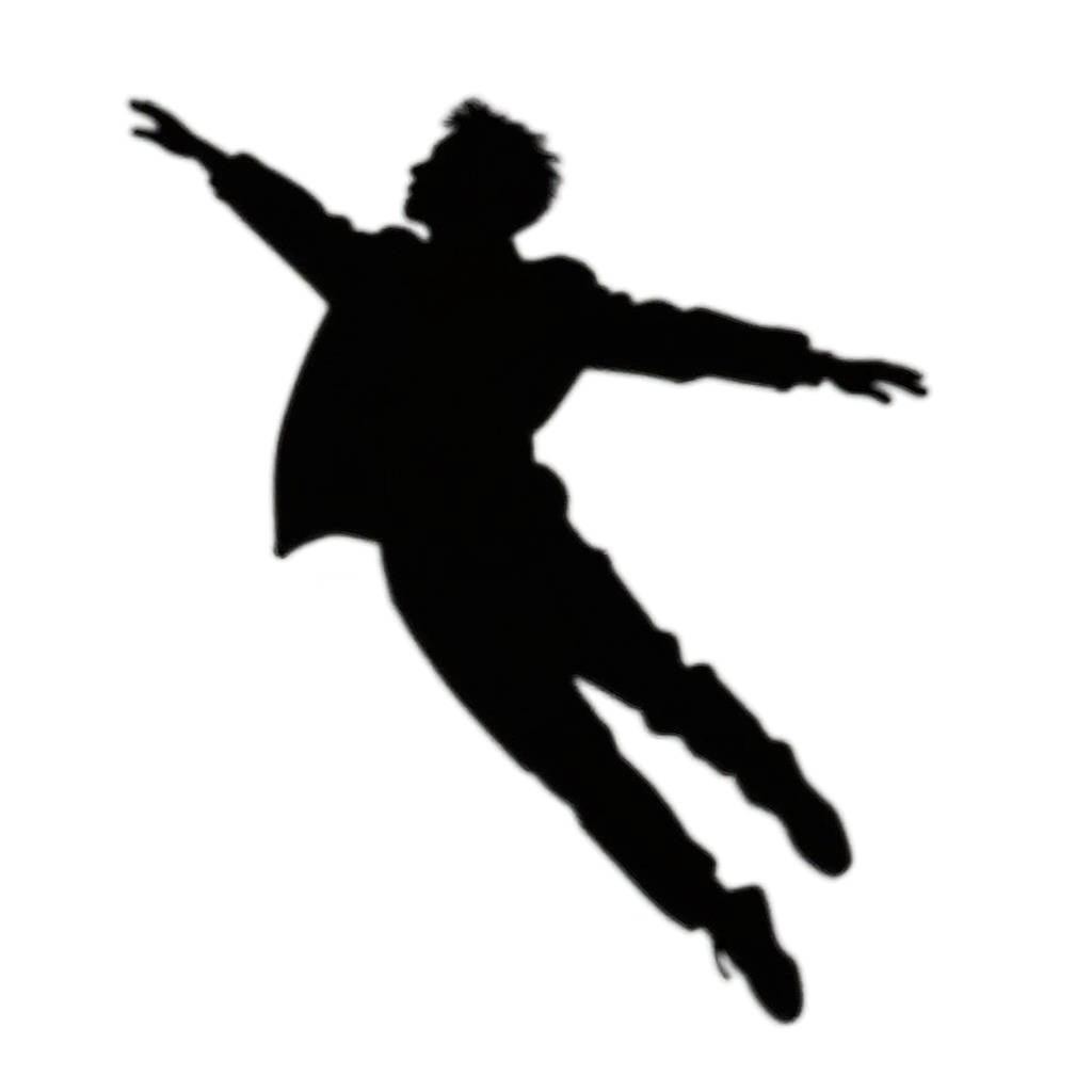 This is a digital drawing of a black silhouette of a person in a dynamic, floating pose against a white background. The figure appears to be mid-motion, with one arm extended and the other bent, and legs slightly spread. The silhouette is slightly blurred, giving a sense of movement. The overall style is minimalistic and abstract.