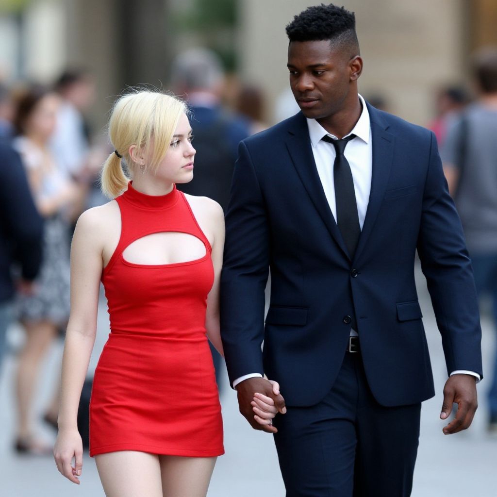 Photograph of a blonde woman and a Black man walking hand in hand. The woman has fair skin, wears a sleeveless, tight red dress with a white oval cutout, and has her hair in a ponytail. The man has dark skin, short curly hair, and is dressed in a black suit with a white shirt and black tie. They are in an outdoor urban setting with a blurred background of people. The woman looks up at the man, who gazes down at her with a slight smile. The image has a vibrant, colorful style with sharp focus on the subjects.