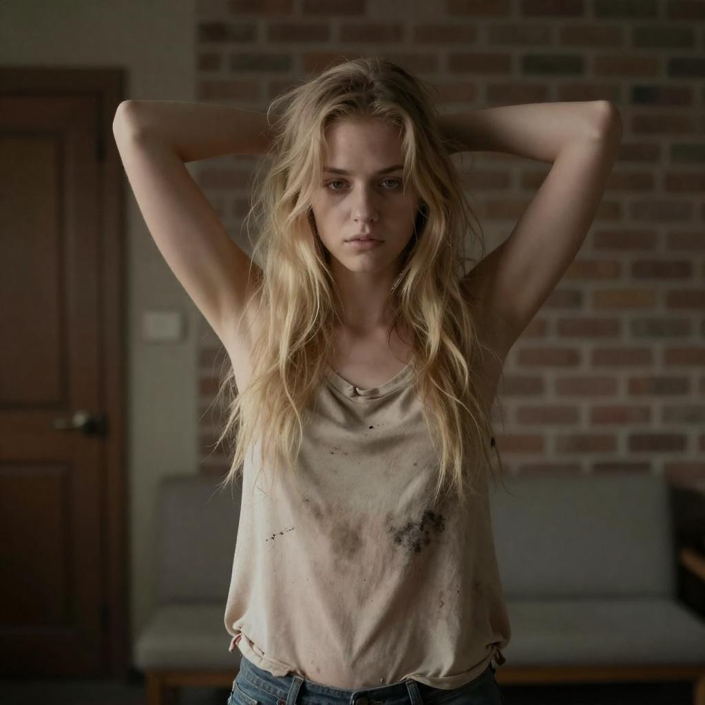 ((woman inside a cluttered barn wearing sexy worn-out torn cotton tanktop)), ((detailed realistic face and eyes)), cinematic lighting, 8k resolution, (modelshoot style), sunset, (from_below:1.4), natural breasts, braless, covered nipples