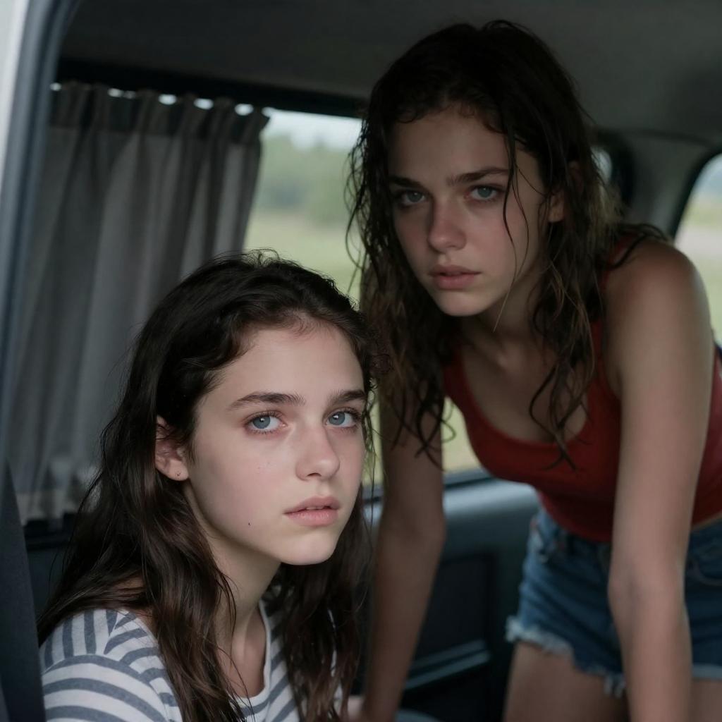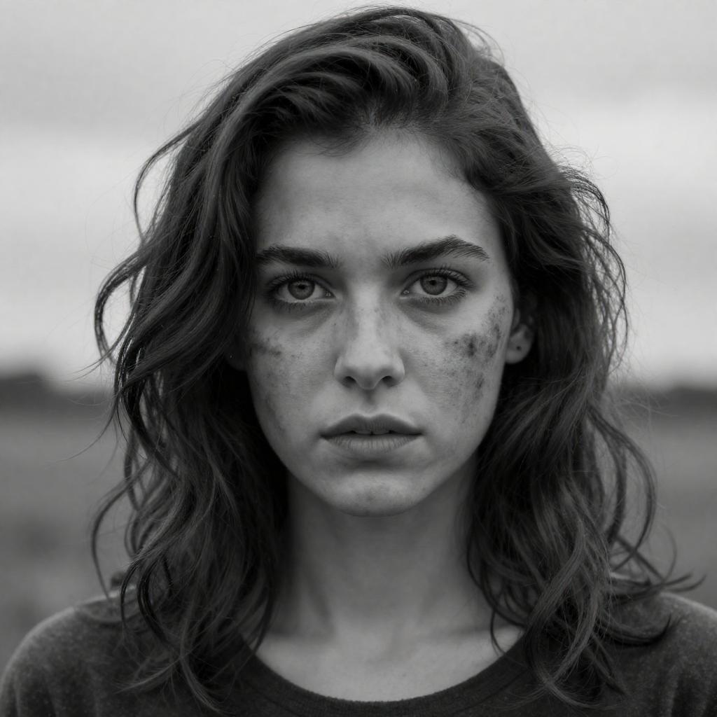Portrait of a young woman with natural skin and curly hair, standing inside a cluttered barn lit by warm sunset light. She is wearing a worn-out, torn cotton tank top with holes and frayed edges, exposing covered nipples. The setting is rustic with wooden walls and scattered items in the background. The photo has a cinematic quality with detailed, realistic facial features and neutral expression.