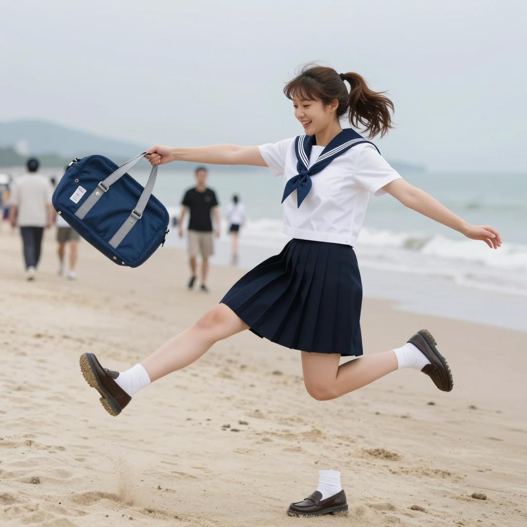 Six girls in green and white checkered skirts and blue scarves, arms outstretched, jumping into a rushing river. Water splashes around them. Background includes greenery and a wooden dock. Girls have various hair colors and styles.