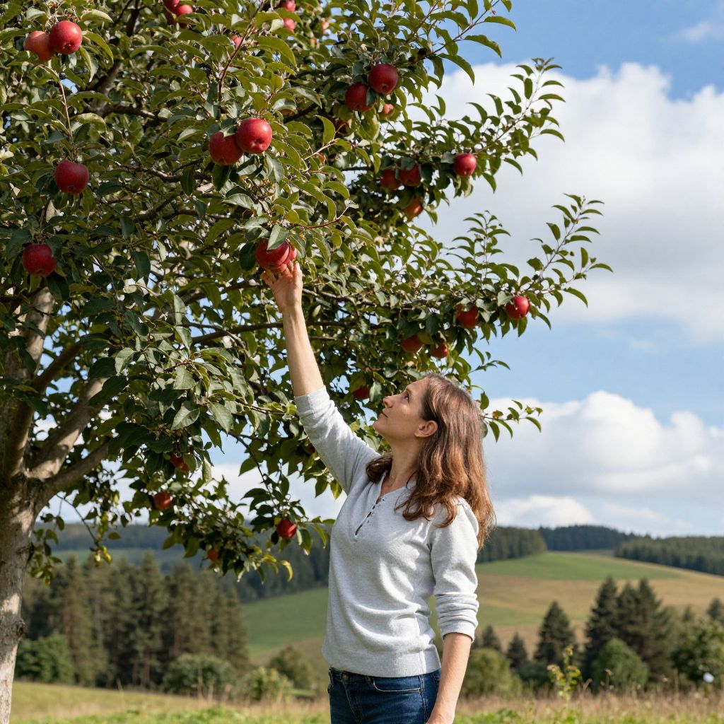 Photograph of a woman with wavy brown hair, white sweater, and blue jeans, reaching for red apples on a tree in a sunny, green