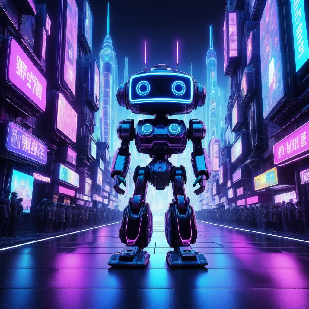 A high-quality 3D render of a transforming robot standing in a neon-lit futuristic city street. The robot has glowing pink and blue accents and a holographic screen on its chest. Surrounding the robot are sleek modern cars and towering skyscrapers adorned with vibrant neon and holographic advertisements, inspired by cyberpunk aesthetics. The scene captures a bustling urban environment with psychological and surreal themes.