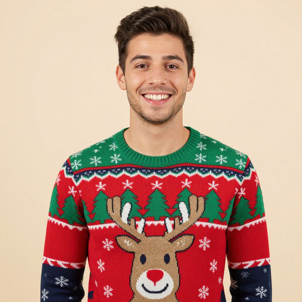 Photograph of a handsome young man with short dark hair and a trimmed beard, standing indoors. He's wearing a festive green Christmas sweater with white and orange patterns, including a large tree design. The warm, golden sunlight streams through a window on the left, casting a cozy glow on his face and the wooden-paneled wall behind him.