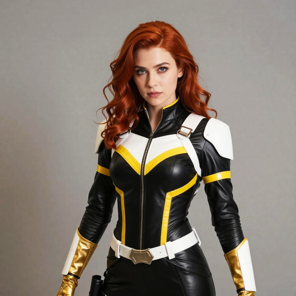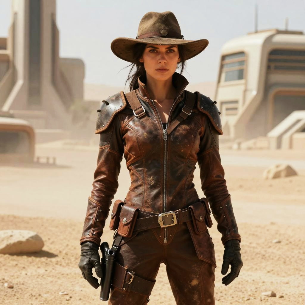 Photograph of a woman standing in a desert with a clear blue sky. She has wavy brown hair, a determined expression, and is wearing a shiny, silver, armored suit with black leather accents. The suit has metallic shoulder plates and a utility belt with pouches. In the background, there's a rundown, white building with a brown roof, and distant mountains. She's holding a gun in her right hand.
