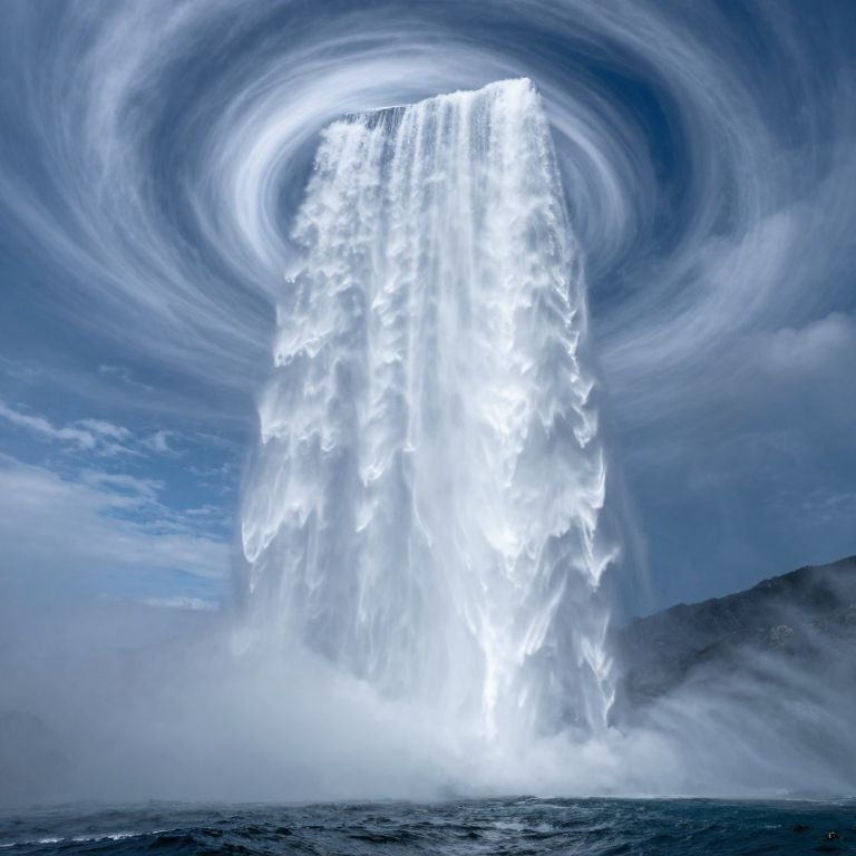 A colossal, inverted waterfall defies gravity, cascading upward from the ocean into a swirling vortex that pierces the sky, transforming the clouds into shimmering veils of water.