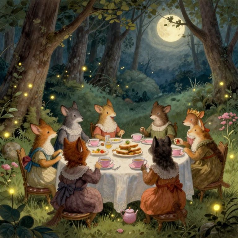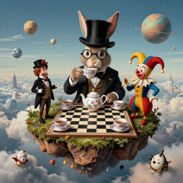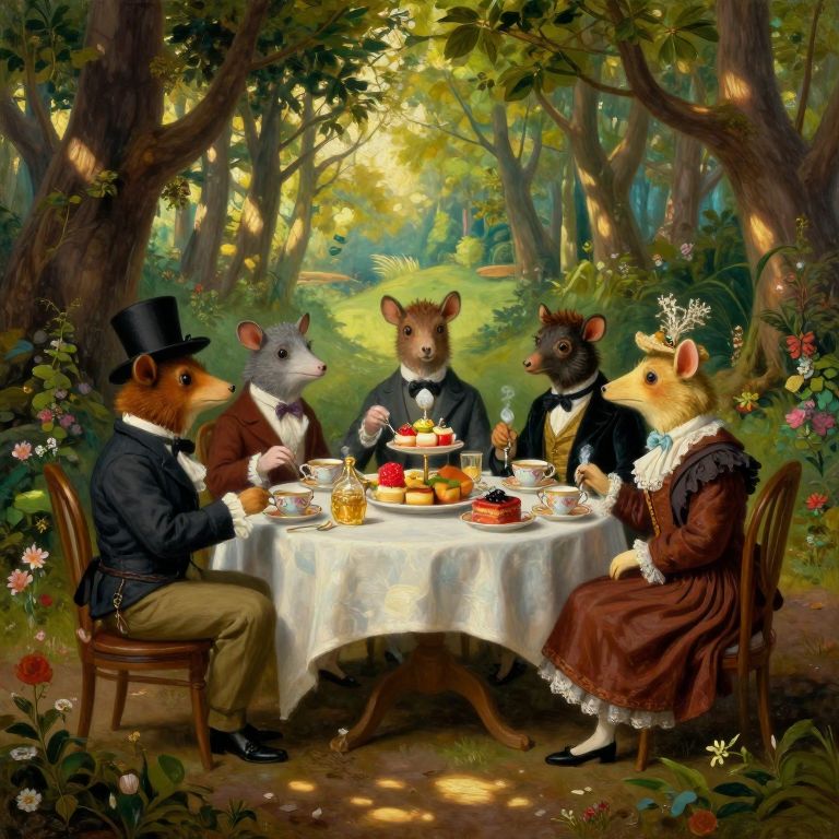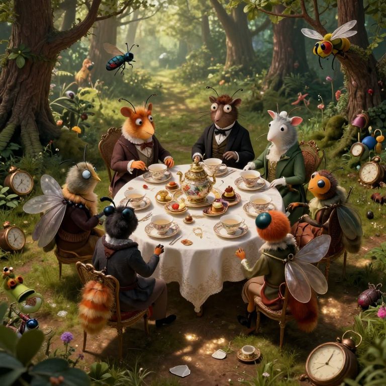 A surreal digital artwork depicting an enchanting tea party with anthropomorphic animals gathered around an extravagant table adorned with oversized teacups and saucers. The scene is captured from a low-angle viewpoint, immersing the viewer in the whimsical gathering as if seated at the table alongside the lively creatures. Vivid colors contrast with distorted forms and fluid, dreamlike elements, such as levitating timepieces suspended in mid-air, creating an alluring atmosphere that conveys both wonder and playfulness within this imaginative yet thought-provoking setting reminiscent of surrealist art.