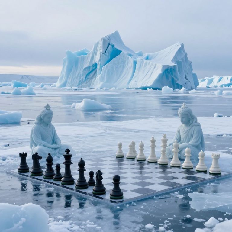 Amidst the serene expanse of a frozen ocean, sentient icebergs engage in a colossal chess match, their strategic movements echoing the shifting tides—a metaphorical dance of transience and eternity, where each piece embodies the quiet resilience and contemplative solitude of existence.
