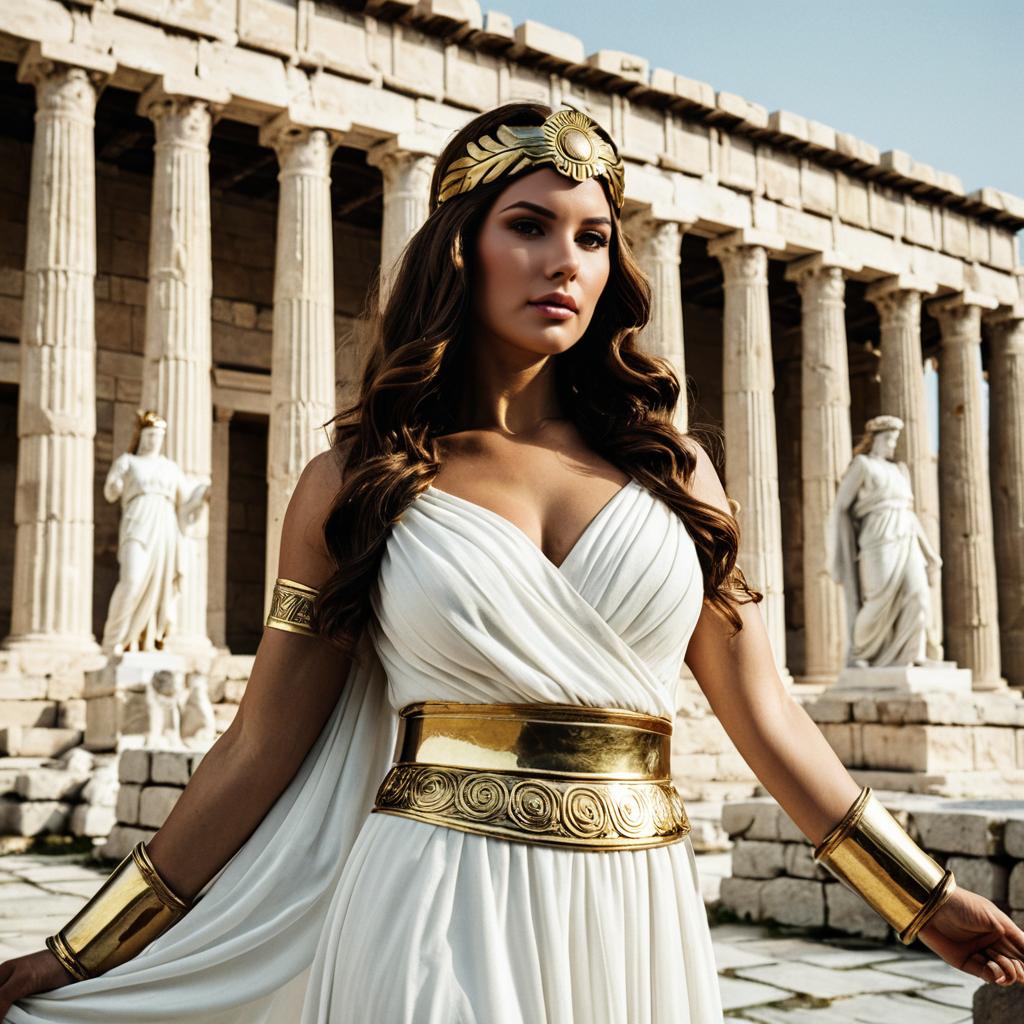 Roman greek costume adults, photorealistic, woman with long brown wavy hair, standing, ancient Greek-inspired white dress with colorful striped borders, gold and green patterns, brown belt with geometric design, stone column background, soft natural light, serious expression, elegant, historical reenactment style, slightly blurred background, daytime, realistic ures, medium shot, detailed fabric folds