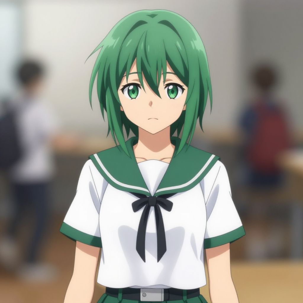 Anime deku costume, 1girl, short hair, green hair, looking at viewer, blurry background, green eyes, blurry, ahoge, school uniform, solo, upper body, belt, ribbon, shirt, neck ribbon, hair between eyes, short sleeves, white shirt, black ribbon, green sailor collar, closed mouth