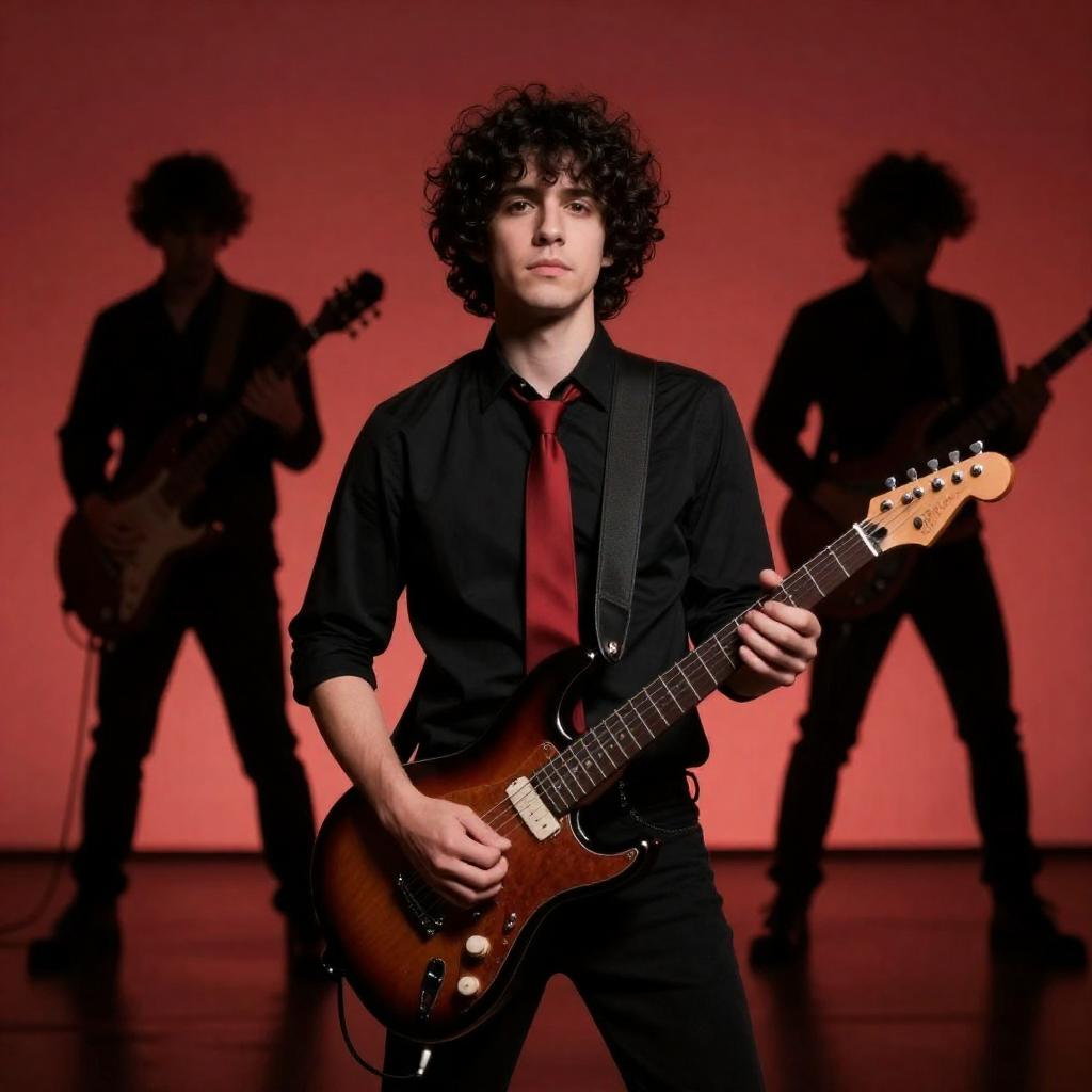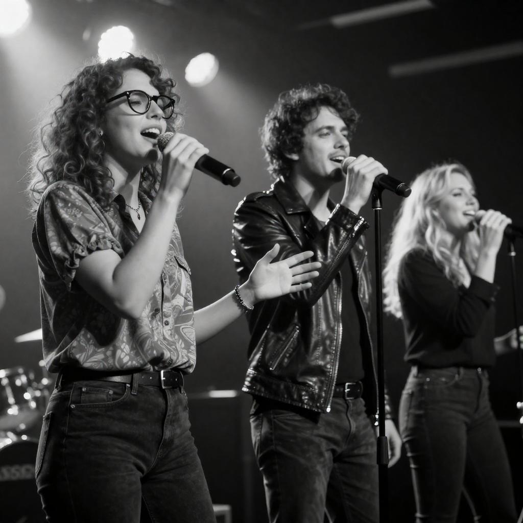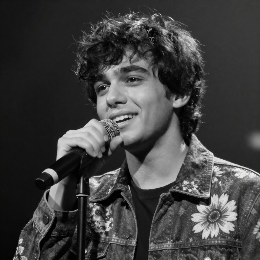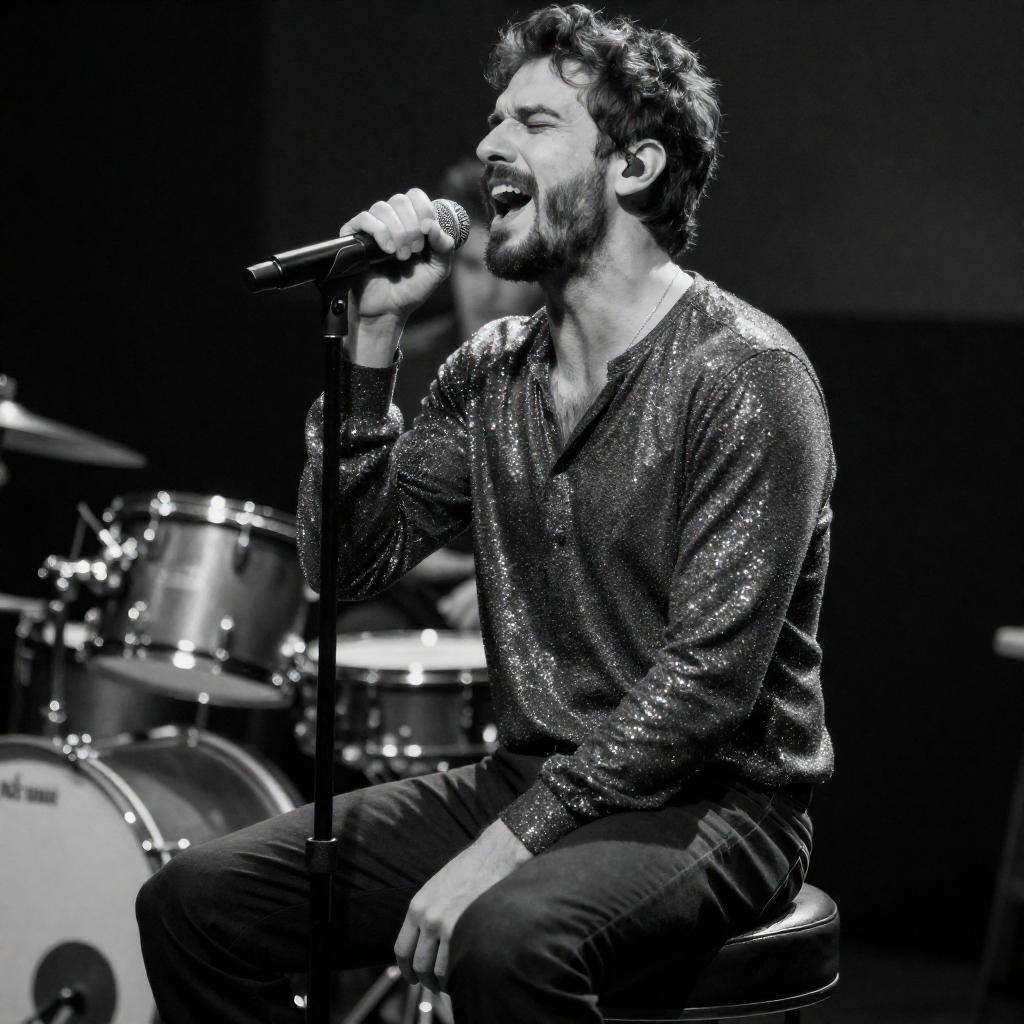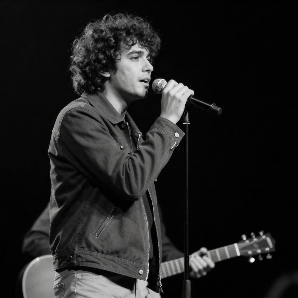 Black-and-white photograph of a male singer with curly hair, wearing a dark jacket and light pants, holding a microphone close to his mouth. He stands slightly turned to the side, with a guitar partially visible in the background. The background is solid black, emphasizing the singer's profile and the microphone.