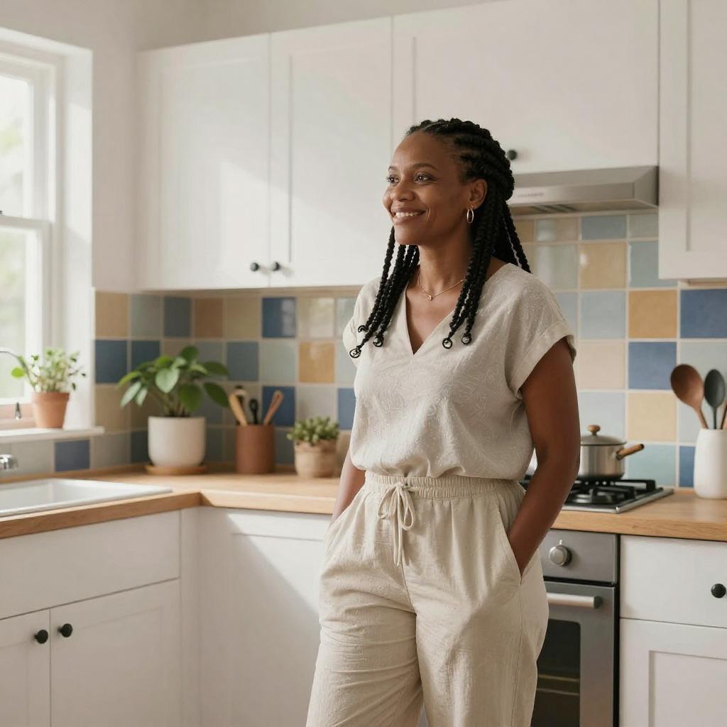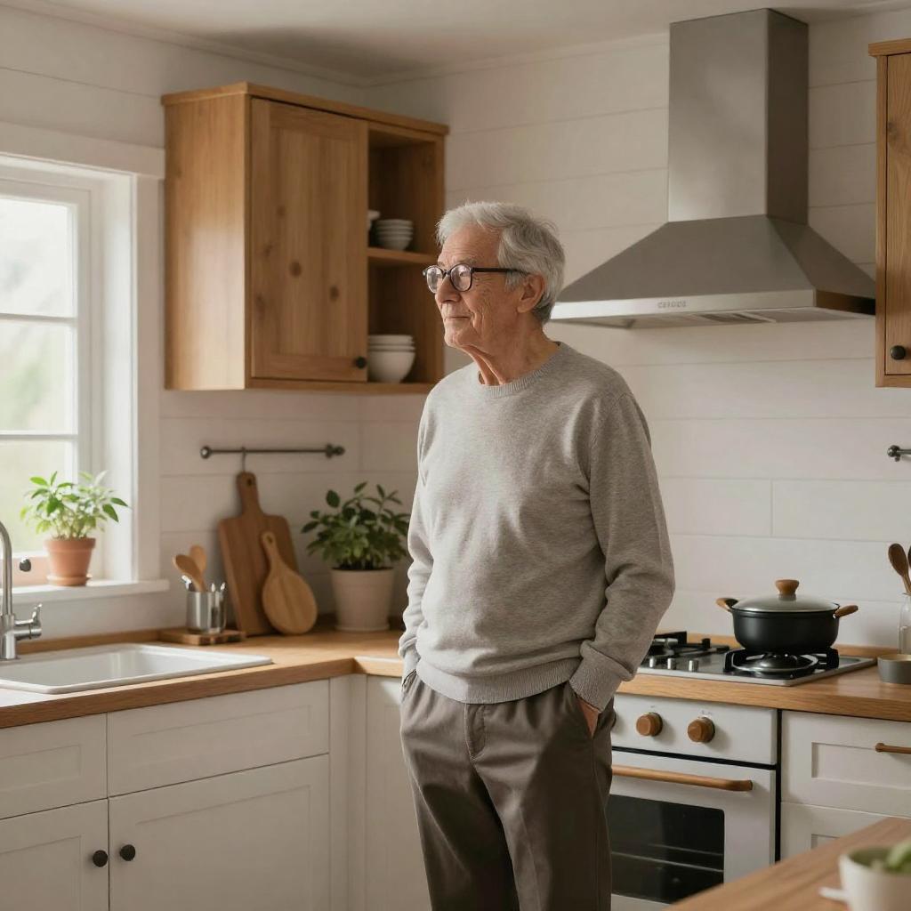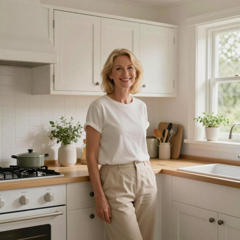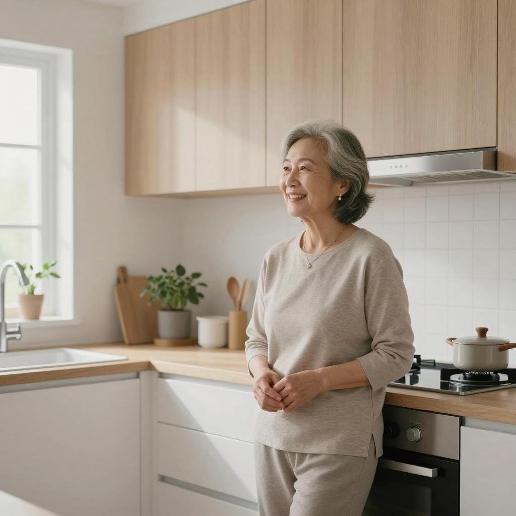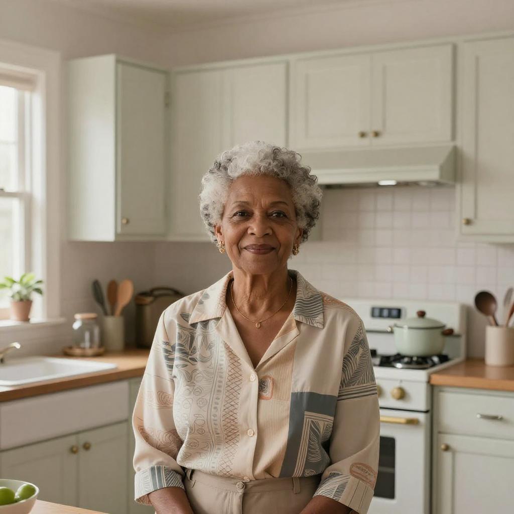 Photograph of an elderly woman with white hair, wearing a beige sweater, standing in a bright, modern kitchen with white cabinets, potted plants on