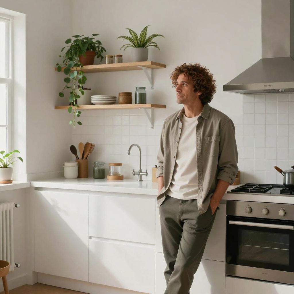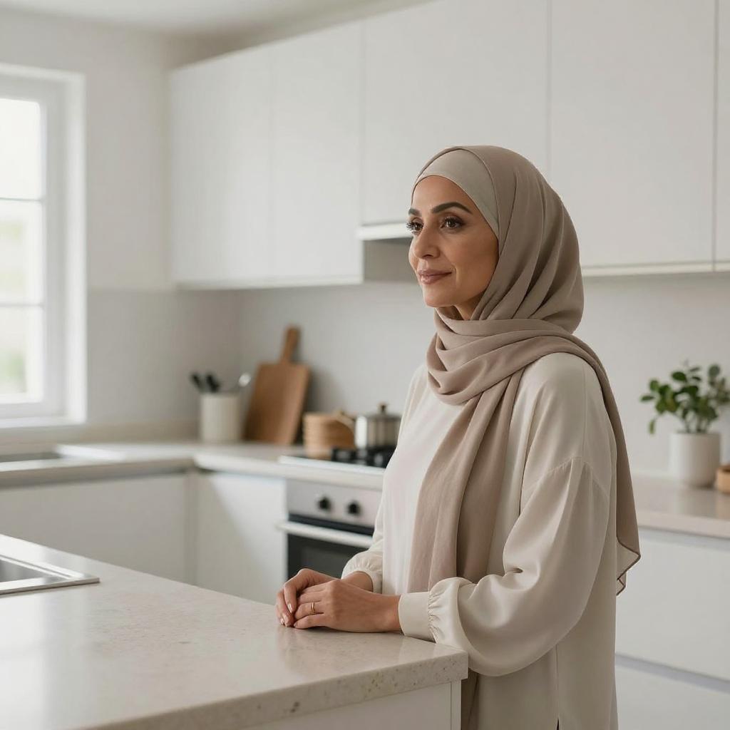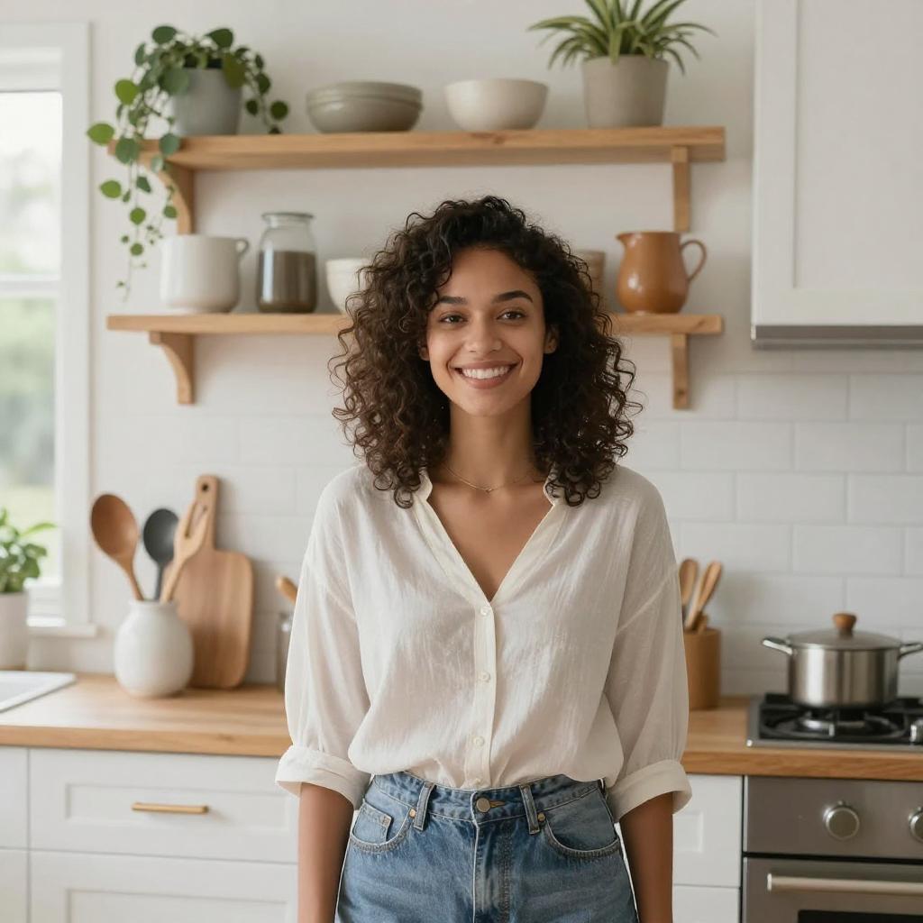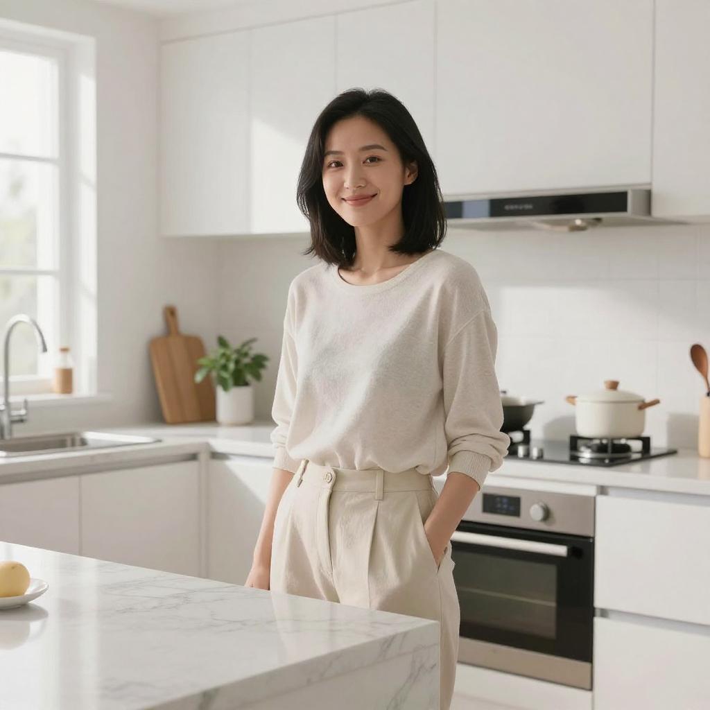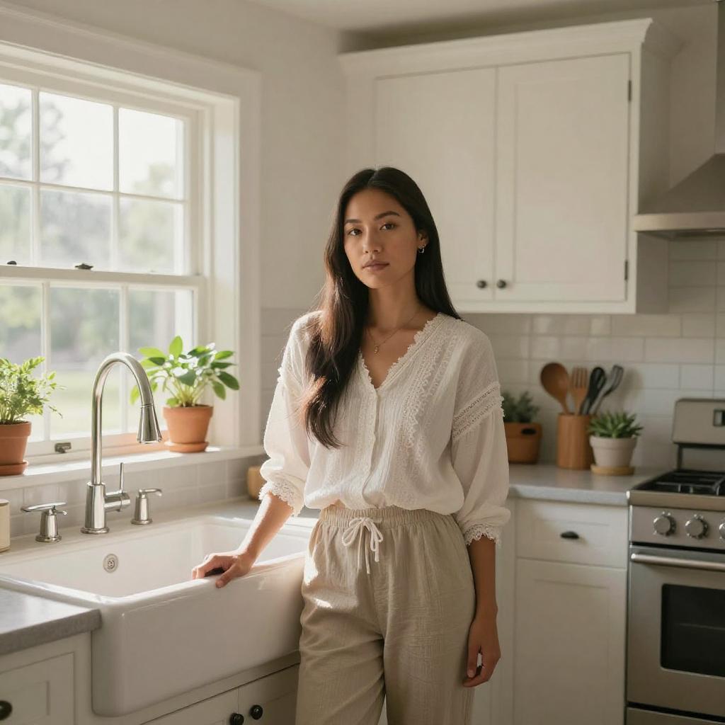 Photograph of an elderly woman with white hair, wearing a beige sweater, standing in a bright, modern kitchen with white cabinets, potted plants on