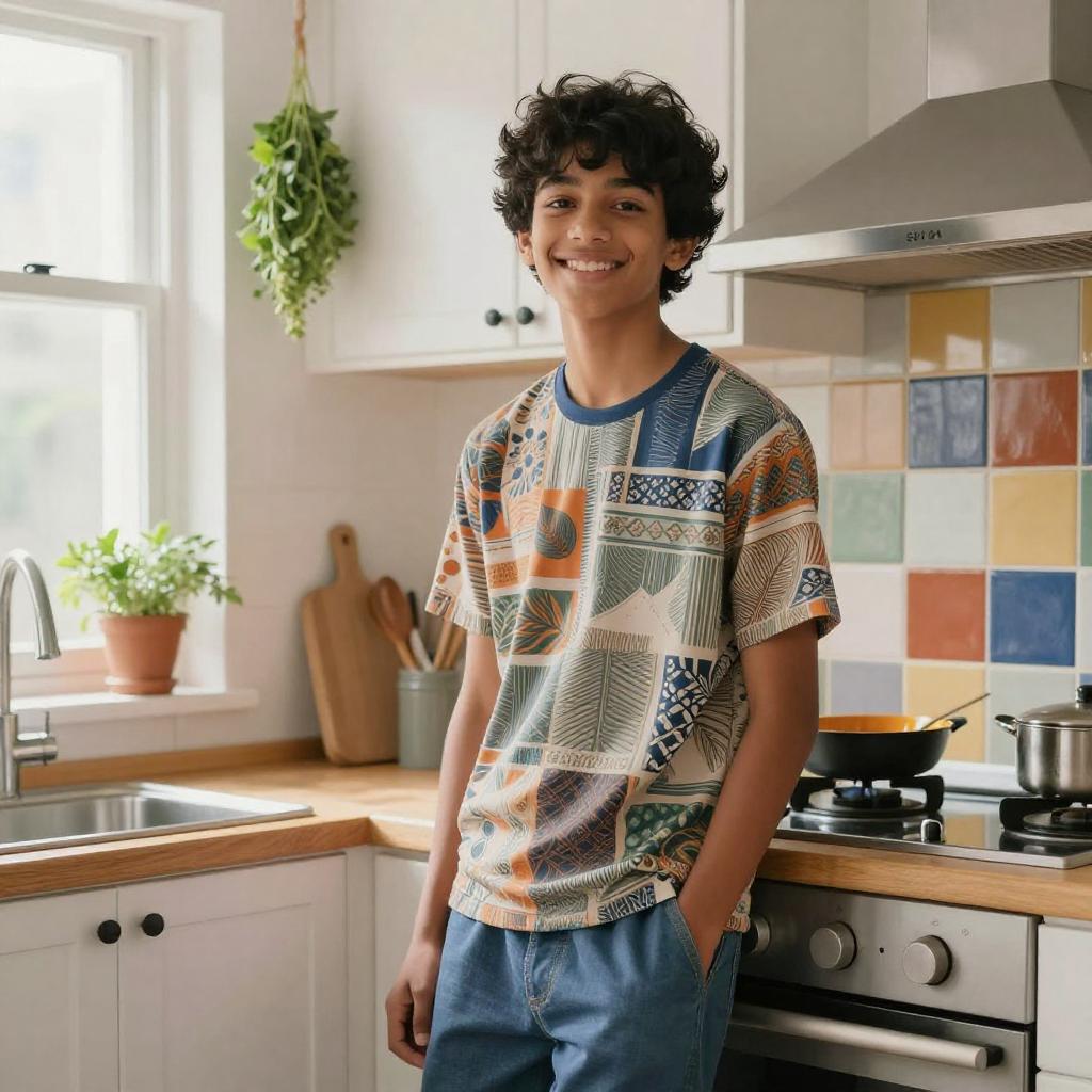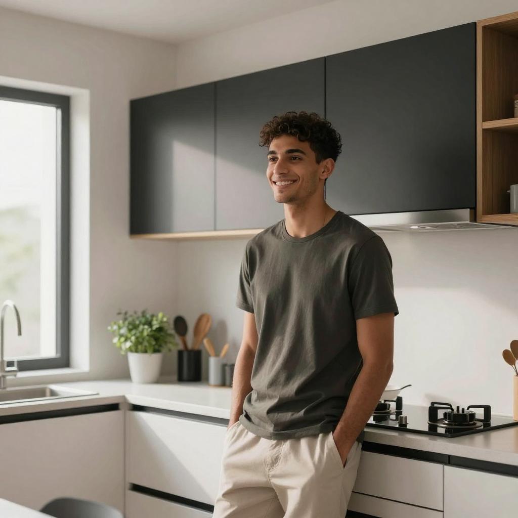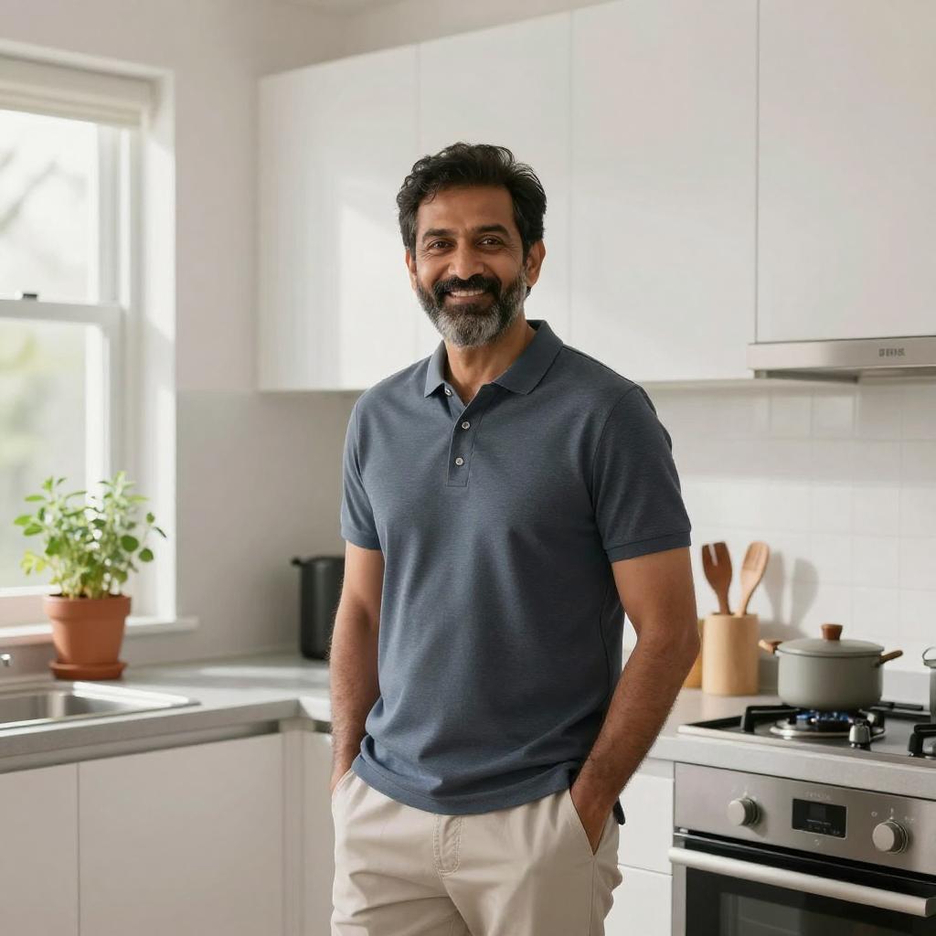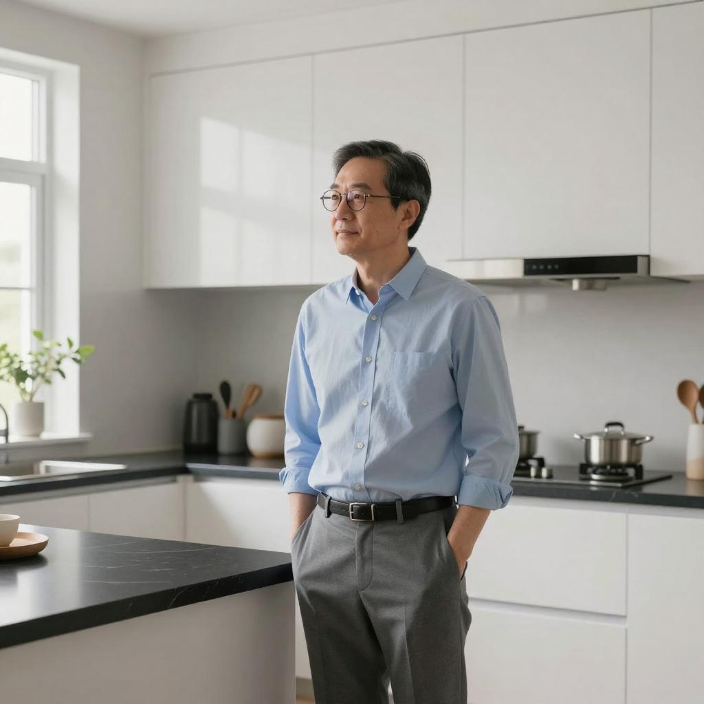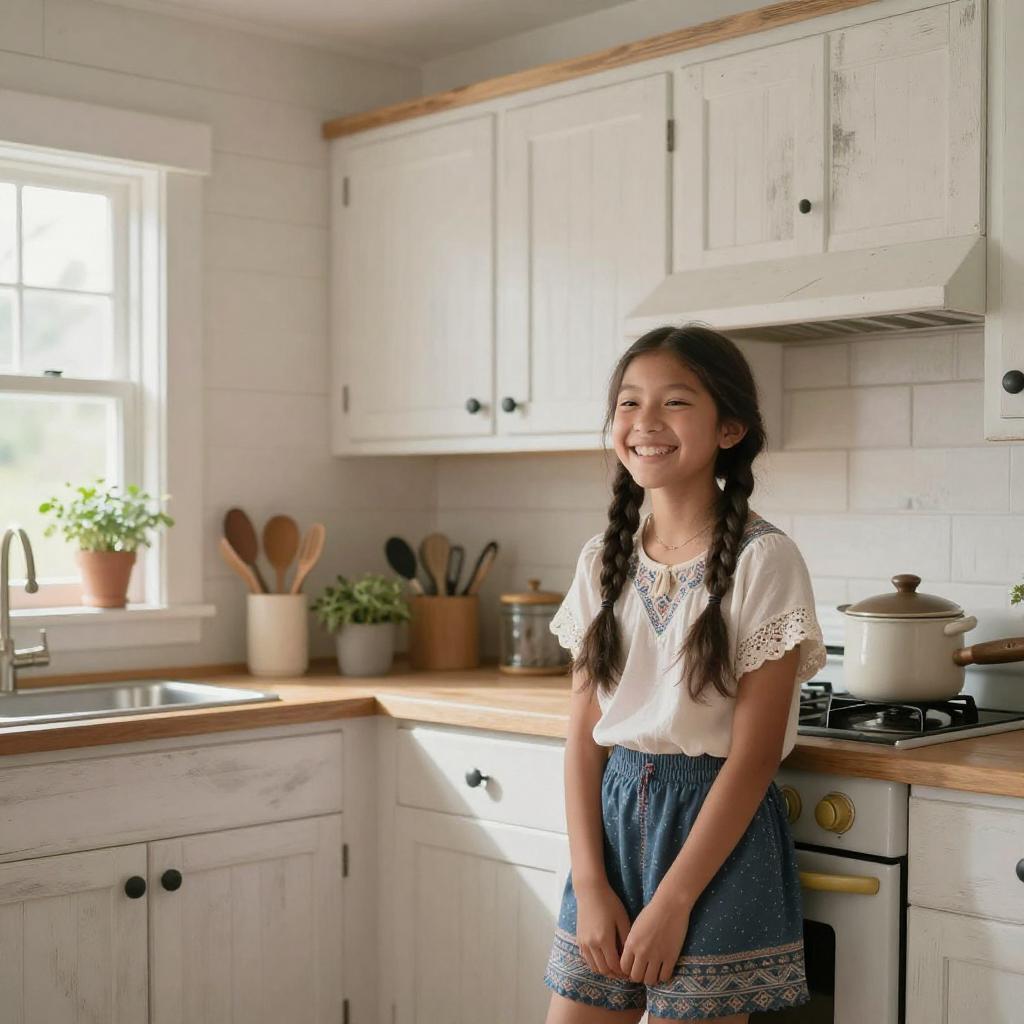 Photograph of an elderly woman with white hair, wearing a beige sweater, standing in a bright, modern kitchen with white cabinets, potted plants on