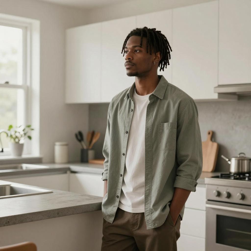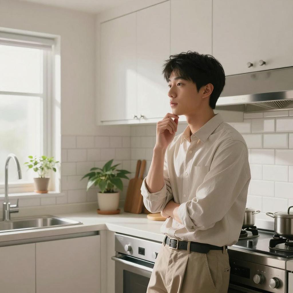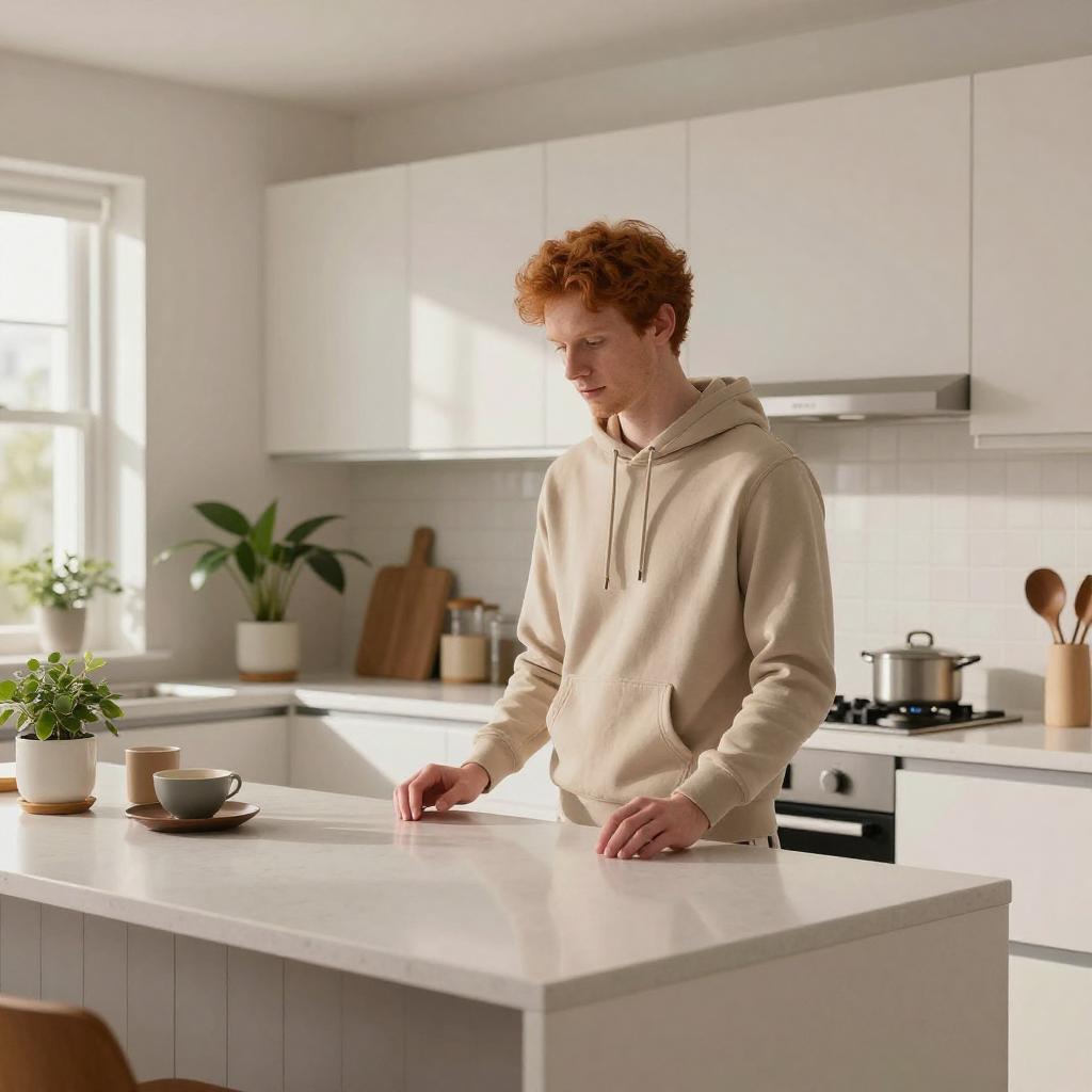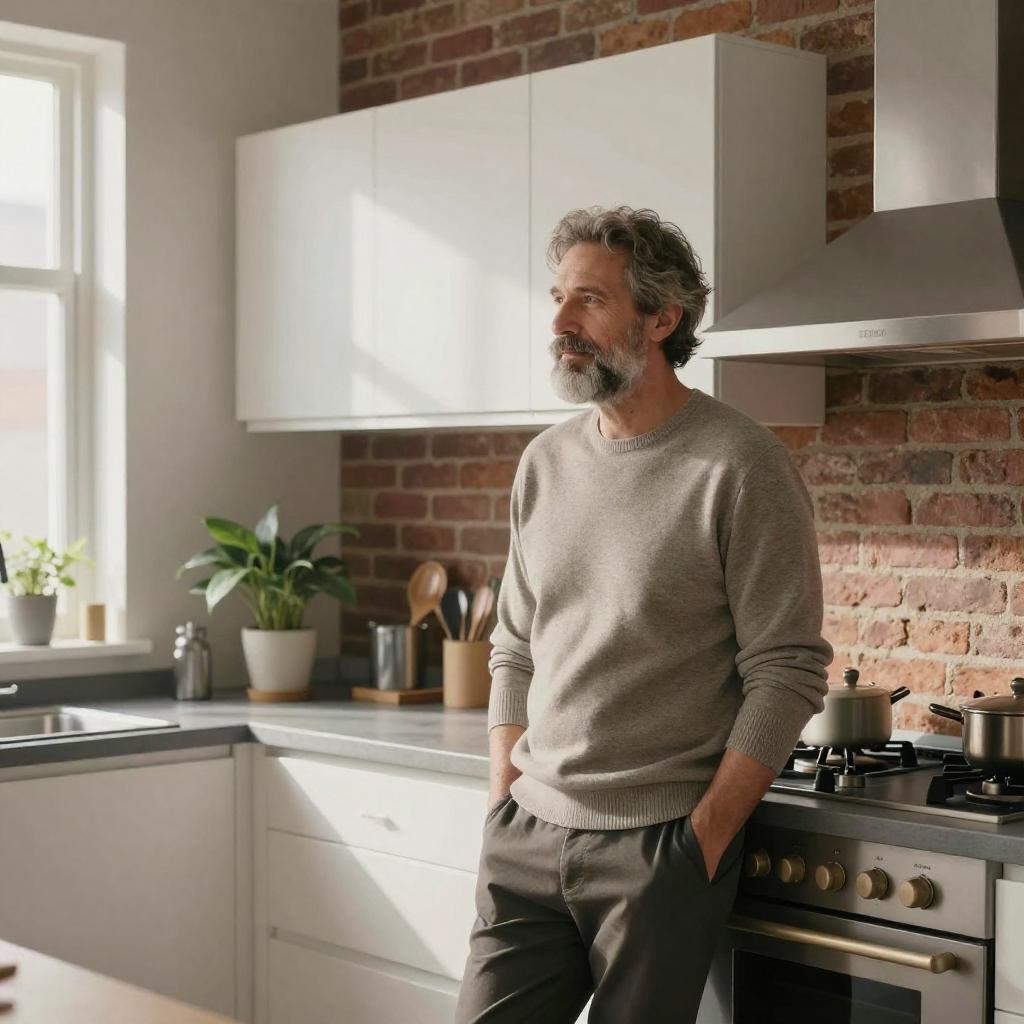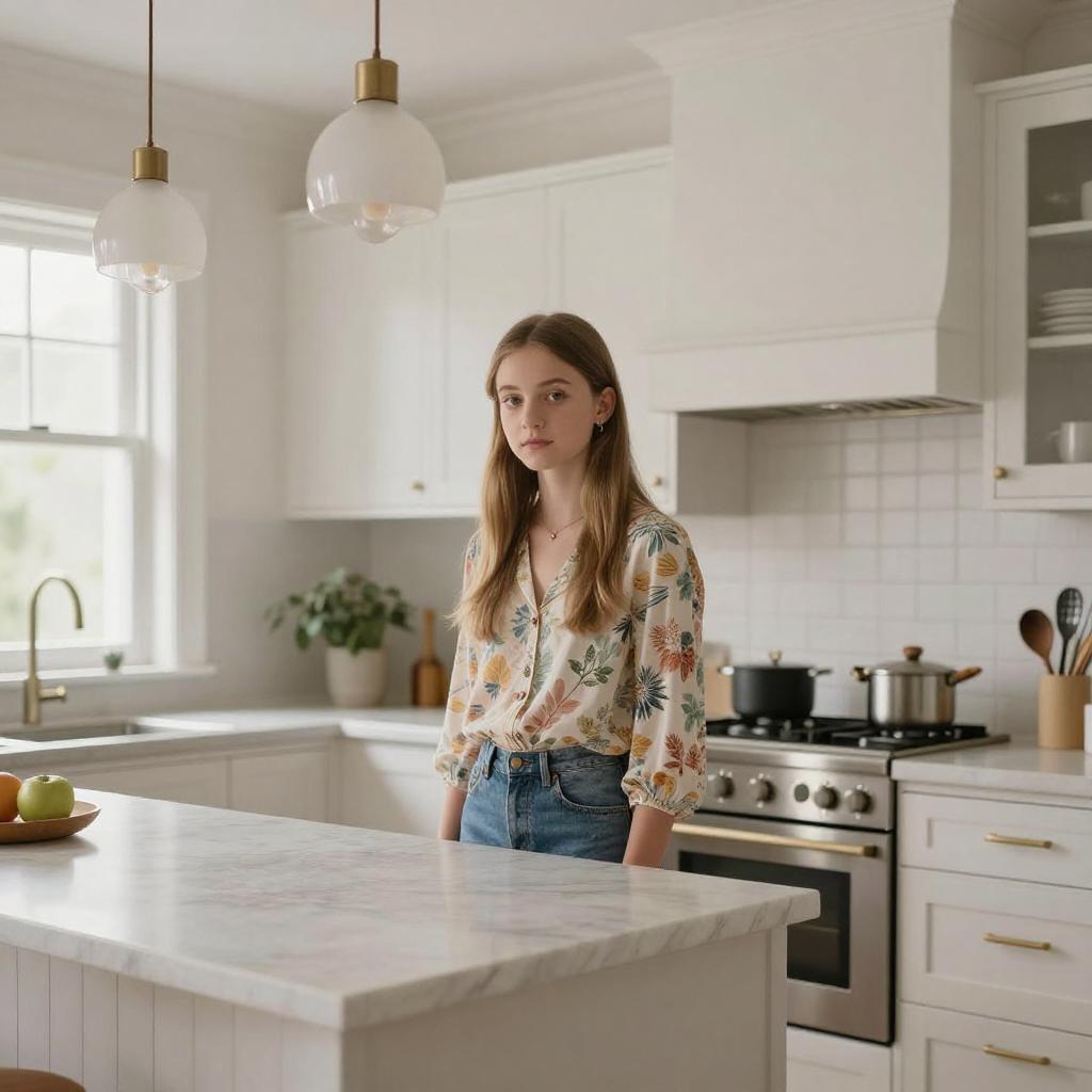 Photograph of an elderly woman with short, white hair, wearing a light beige sweater and beige pants, standing in a bright, modern kitchen. She is smiling softly and looking to the right. In front of her is a white marble countertop with two small potted plants and a white plate. The kitchen has white cabinets, a stainless steel stove, and wooden ceiling beams. Sunlight streams in through a window on the left, casting natural light and shadows across the scene. The background includes a glimpse of a green hedge outside.