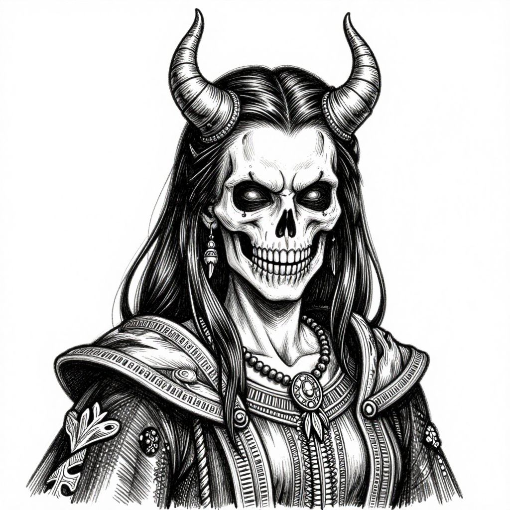 This is a digital black-and-white illustration of a female figure with a skull-like face, characterized by hollow eye sockets and a wide, toothy grin. She has long, straight hair flowing down her shoulders and two prominent, curved horns on her head. She wears a detailed, textured jacket with a high collar, adorned with intricate patterns and a beaded necklace. The illustration is done in a highly detailed, cross-hatching style, emphasizing shadows and textures, with a stark white background that contrasts sharply with the dark, intricate linework of the character.