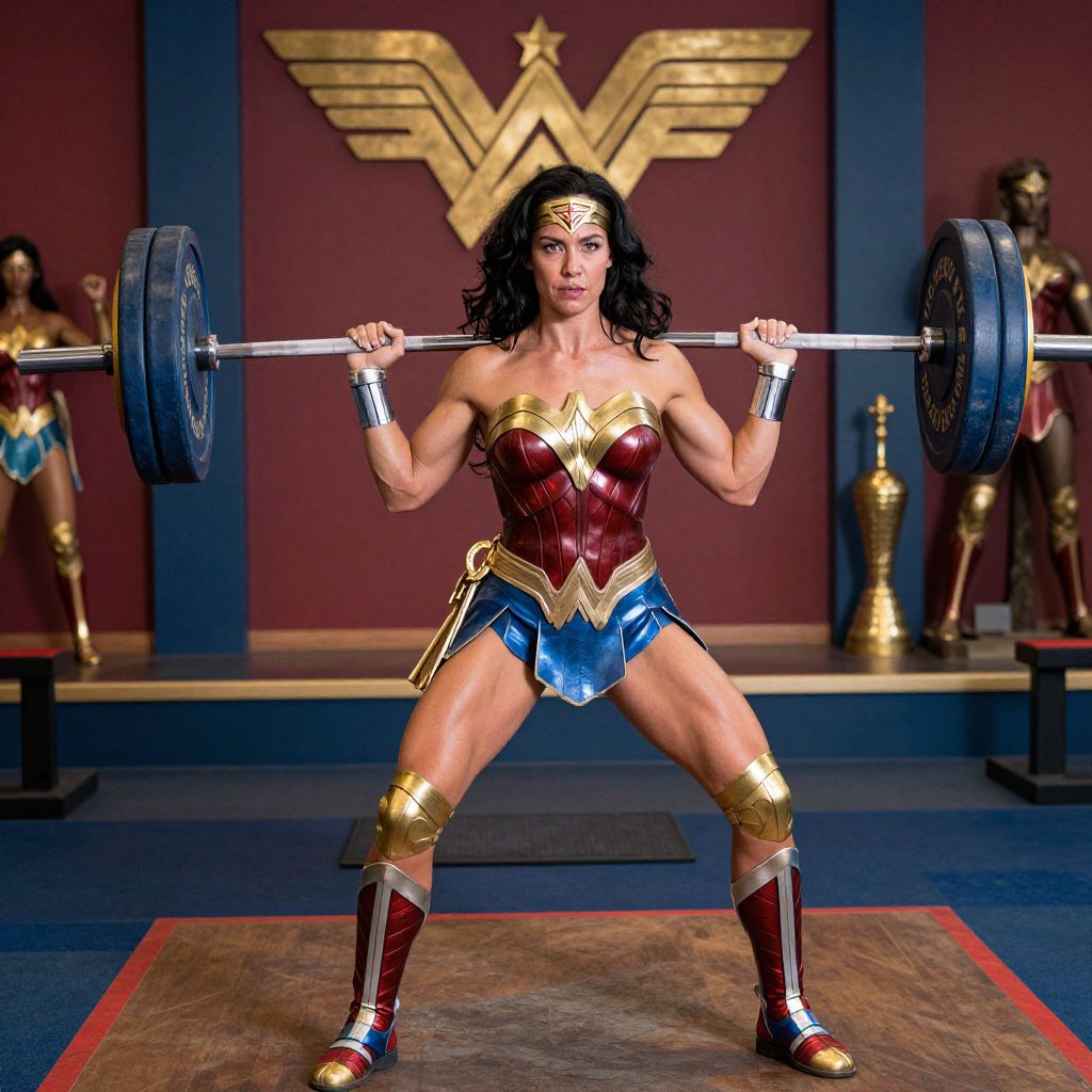 Photorealistic CGI of muscular Wonder Woman lifting a heavy barbell in a gym, wearing iconic red, gold, and blue costume, with a large
