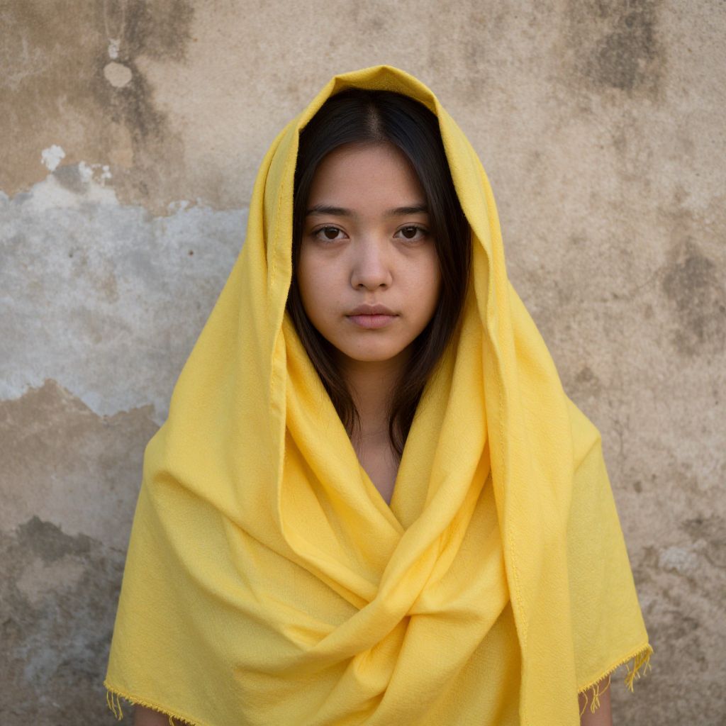 Enveloped in a vibrant yellow scarf, a young woman stands against a weathered wall, her gaze piercing through the veil of time, embodying resilience and the quiet strength of enduring hope.