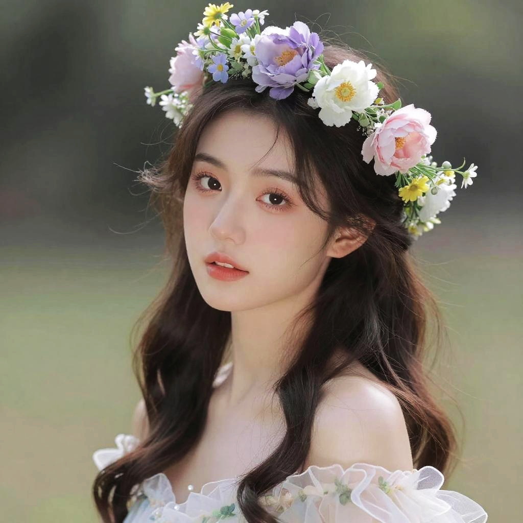 A captivating portrait of a woman adorned with delicate floral accessories, set against a dreamy, ethereal background. Her gown and floral crown create a whimsical ambiance, evoking a sense of fantasy and nature's beauty.
