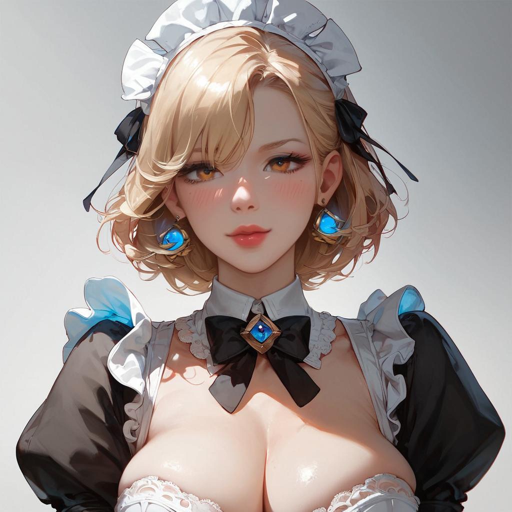 Score_9, score_8_up, score_7_up, , cute woman, (huge brea BREAK 1.3), wearing maid costume, r3dstyle, female maid costume, r3dstyle color grading, vibrant reds, high contrast, intricate lace details, glossy texture, cinematic lighting, photorealistic, sharp focus