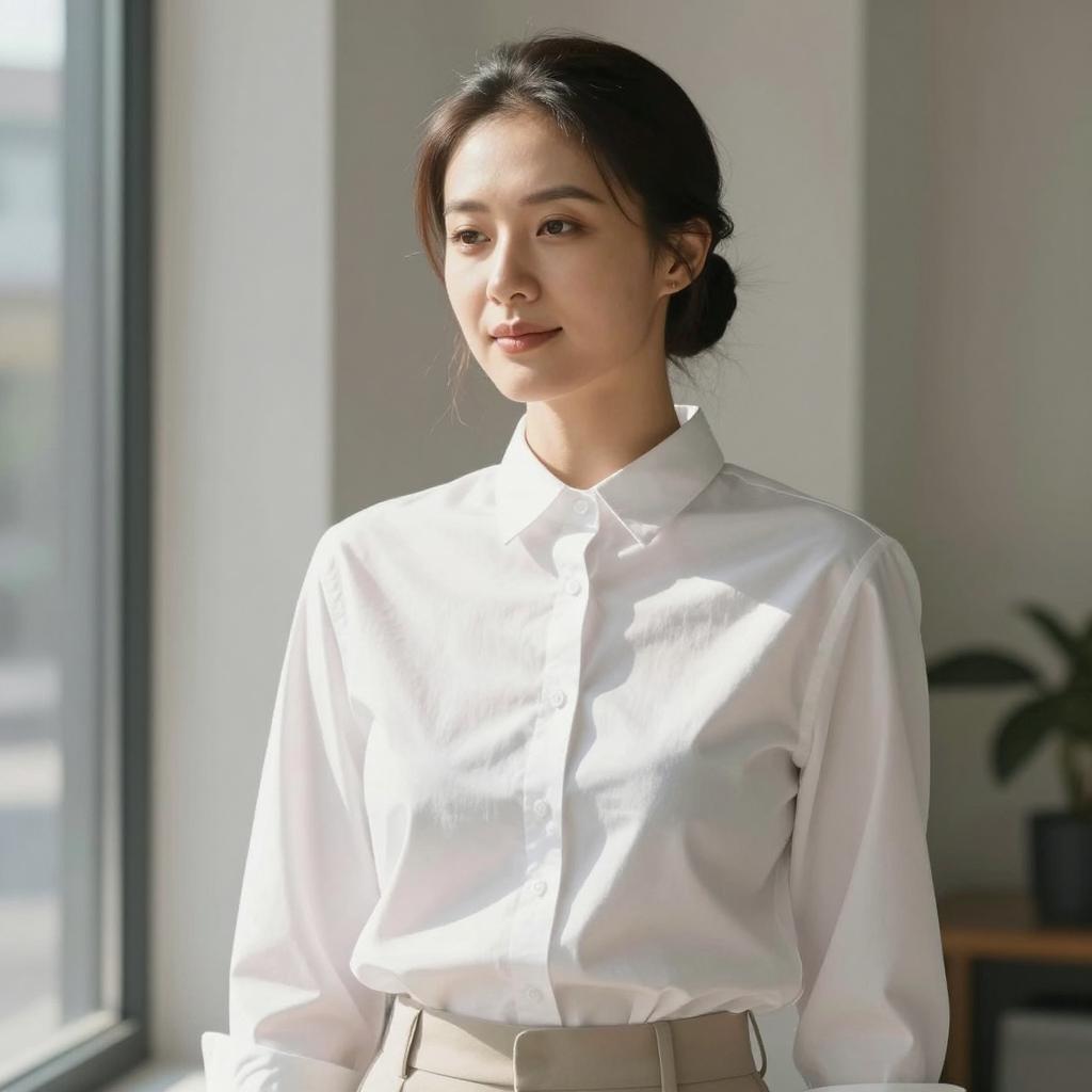 Secy costume woman, photograph of an Asian woman, standing indoors, sunlight through window, wearing a white, long-sleeved, high-collared button-up shirt, belted at the waist, dark hair in a bun, serious expression, natural light, soft shadows, modern minimalist background, gentle smile, elegant, sharp features, light makeup, subtle earrings, daytime, casual yet refined, realistic style