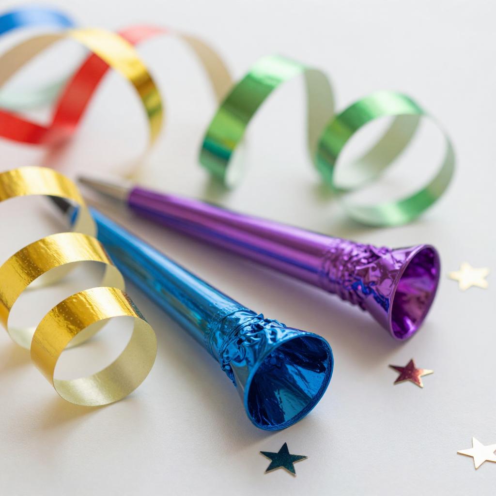 Photograph of colorful party decorations taken from a slightly low angle with bright, even lighting. Foreground features metallic blue and purple party horns, with yellow, red, and green ribbons curling around them. Background is blurred, showing scattered star-shaped confetti on a white surface. The depth of field keeps the party horns in focus while the background is softly blurred.
