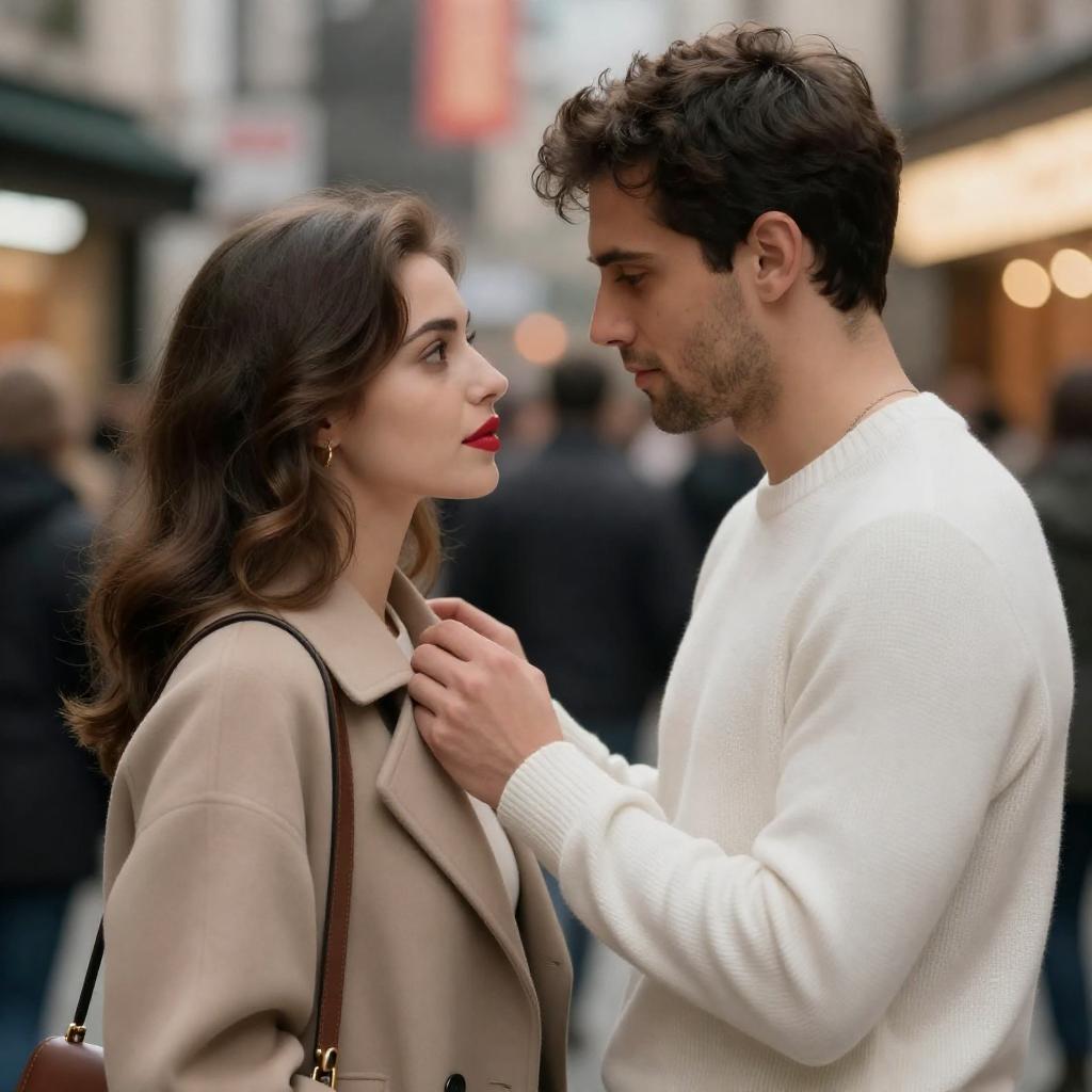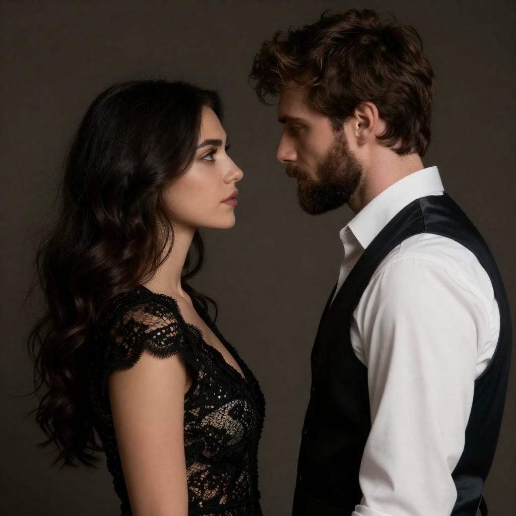 Photograph of a man with dark hair and beard in a black jacket with white cuffs, holding a letter, standing behind a woman with fair skin and brown hair in an elaborate yellow off-the-shoulder dress, holding a red rose to her lips. Background shows a blurred, outdoor stone wall.